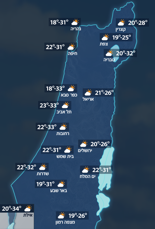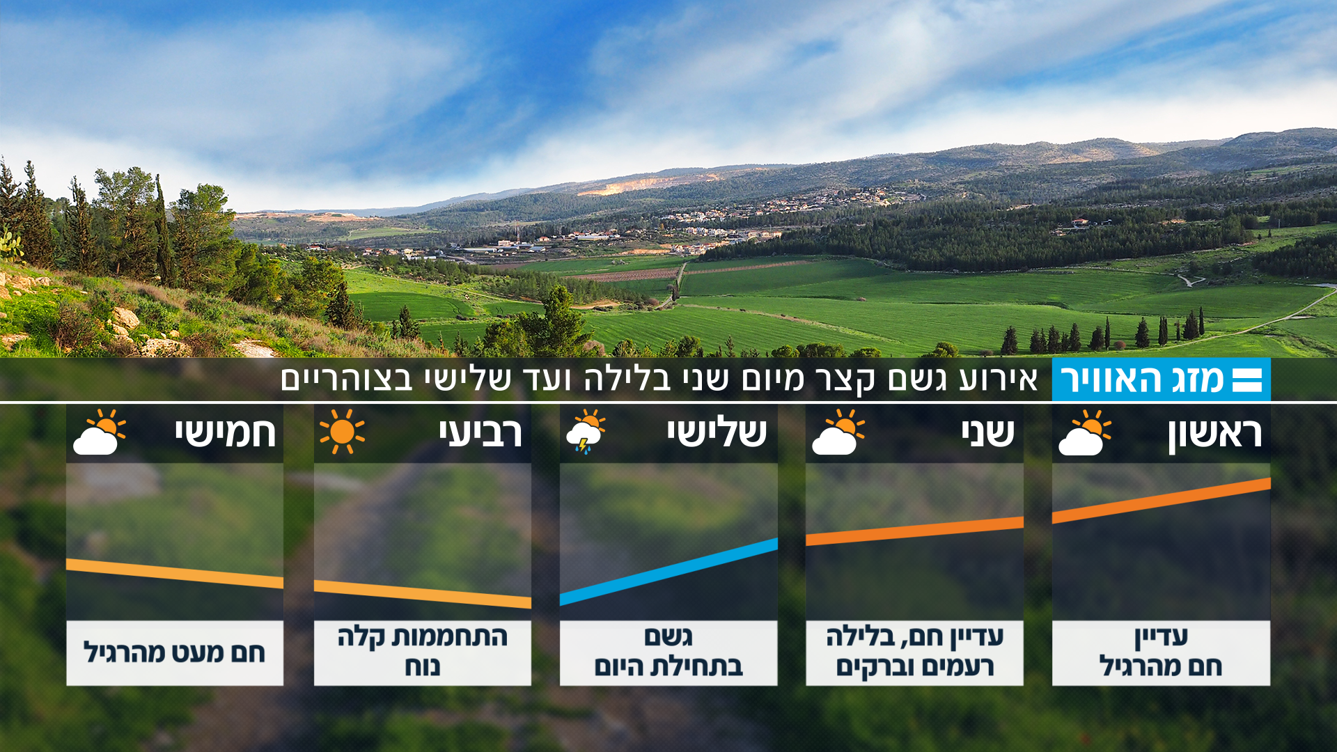 ביומיים הקרובים הטמפרטורות ירדו, אך מזג האוויר יישאר חם מהרגיל • מחר בלילה יתחיל אירוע גשם קצר שיימשך כמעט יממה, ועשוי להיות מלווה בברקים ורעמים • הטמפרטורות יוסיפו לרדת בשלישי, אך ברביעי ובחמישי הן יעלו שוב - ומזג האוויר יחזור להיות חם מהרגיל