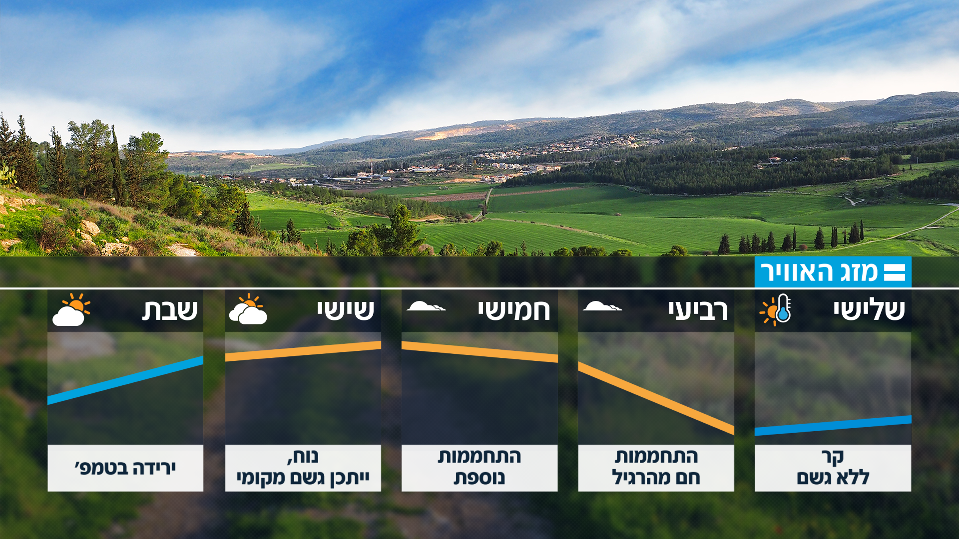היום (שלישי) תחול ירידה בטמפרטורות והן יהיו נמוכות מהרגיל לעונה. בשמיים יהיה בהיר ברוב האזורים בארץ. מחר יחול שינוי, וניכנס למגמת התחממות, והתעננות - עם ענני צירוס גבוהים. בחמישי תחול התחממות נוספת, והחל מיום שישי נעבור בחזרה למגמת התקררות, כשייתכן גשם מקומי בשעות אחר הצוהריים. בשבת צפויה התקררות נוספת, אך כרגע אין מערכת גשם משמעותית באופק.