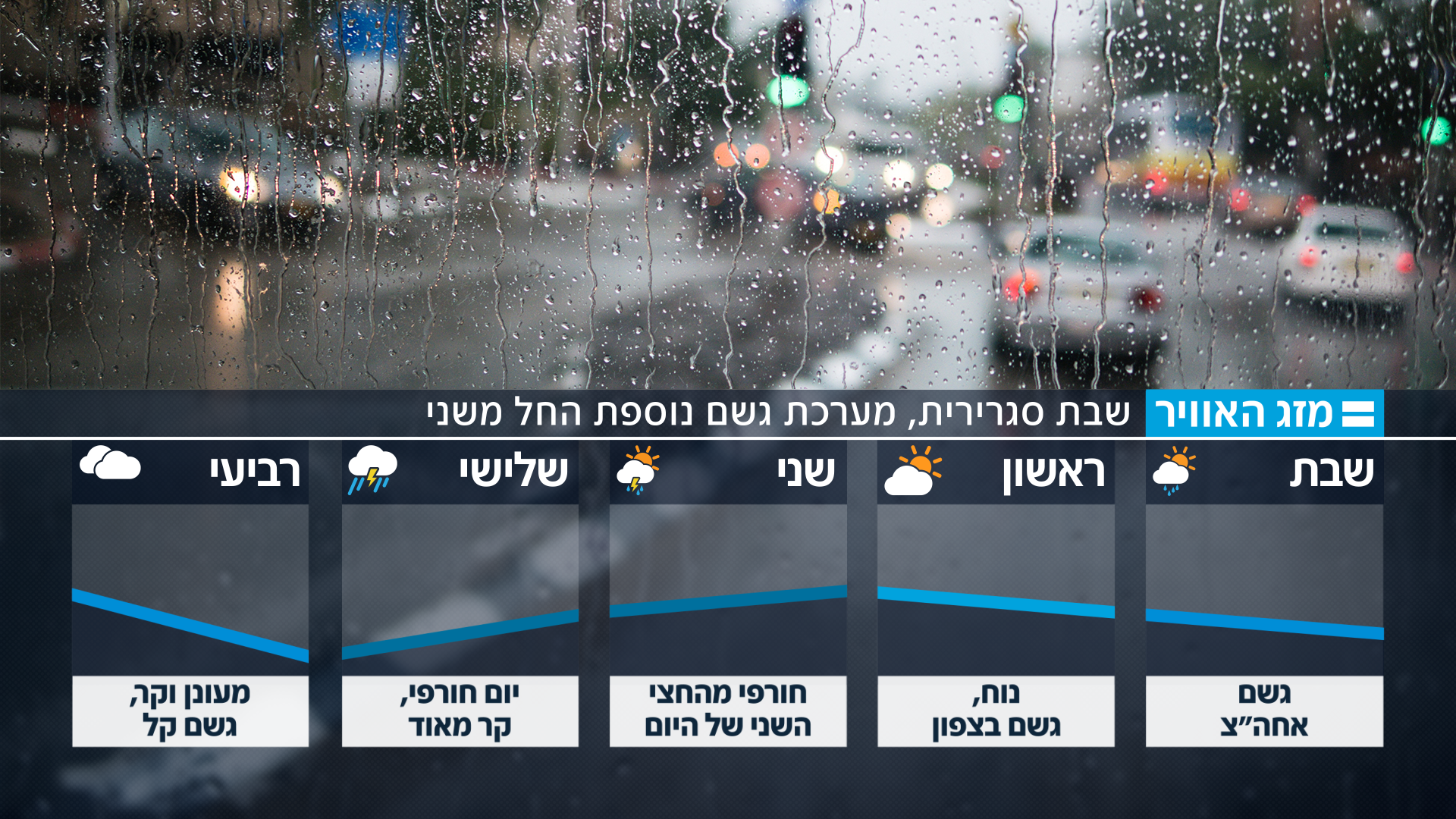 היום (שבת) תחול עלייה קלה בטמפרטורות, אך מזג האוויר עדיין יהיה קריר ומעונן, עם גשם מקומי בצפון לאורך היום. בשעות אחר הצוהריים צפוי גשם זמני גם באזור המרכז, בעיקר בהרי המרכז. בים התיכון הגלים צפויים להגיע לגובה של עד 4 מטרים.