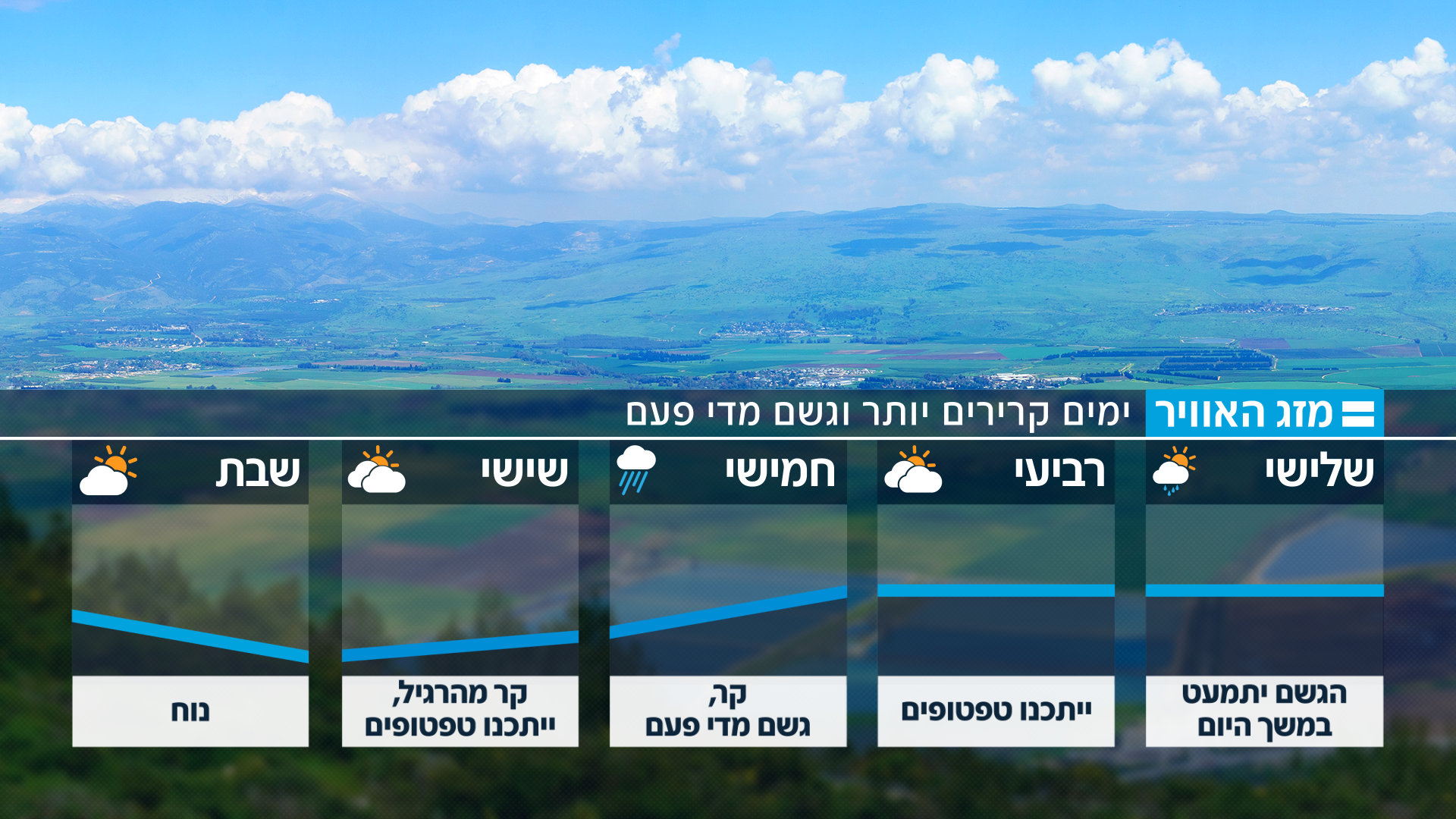 בשישי יהיה קריר מהרגיל, אבל נוח יותר עם אפשרות לטפטופים. בשבת תחול עלייה קלה בטמפרטורות ויהיה מעונן חלקית ונוח.
