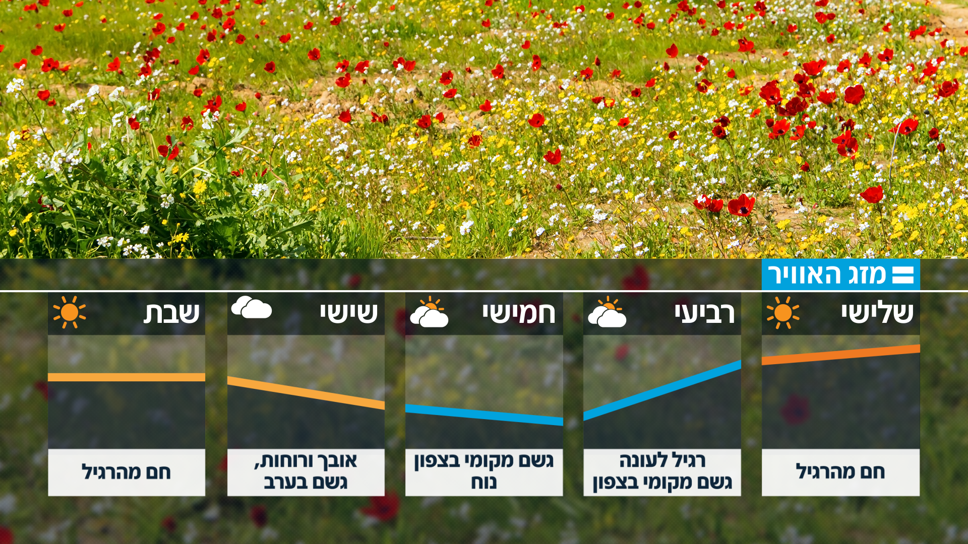 היום (שלישי) תחול ירידה בטמפרטורות, אך עדיין מדובר במזג אוויר חם מהרגיל לעונה. השינוי: התנקות של העננים בשמיים ומזג אוויר בהיר לחלוטין. ברביעי וחמישי הגשם צפוי לחזור באזור הצפון והטמפרטורות ירדו. בסוף השבוע - שינוי חד נוסף במזג האוויר: תורגש עלייה ניכרת בטמפרטורות, לצד רוחות חזקות וסיכוי לאובך.