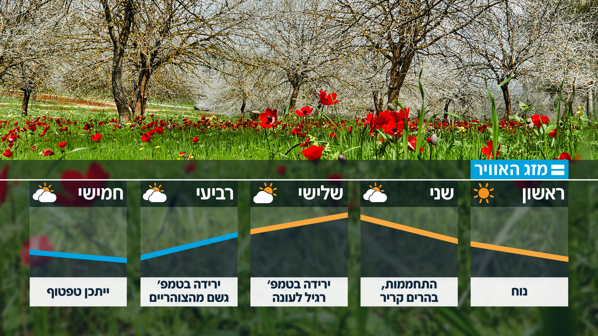 הטמפרטורות תהיינה היום רגילות לעונה, ובחוץ יהיה בהיר • מחר תורגש התחממות נוספת ובמרבית אזורי הארץ יהיה נוח • בשלישי תחל התקררות מסוימת, לקראת מערכת גשם קצרה שצפויה ביום רביעי • התחזית