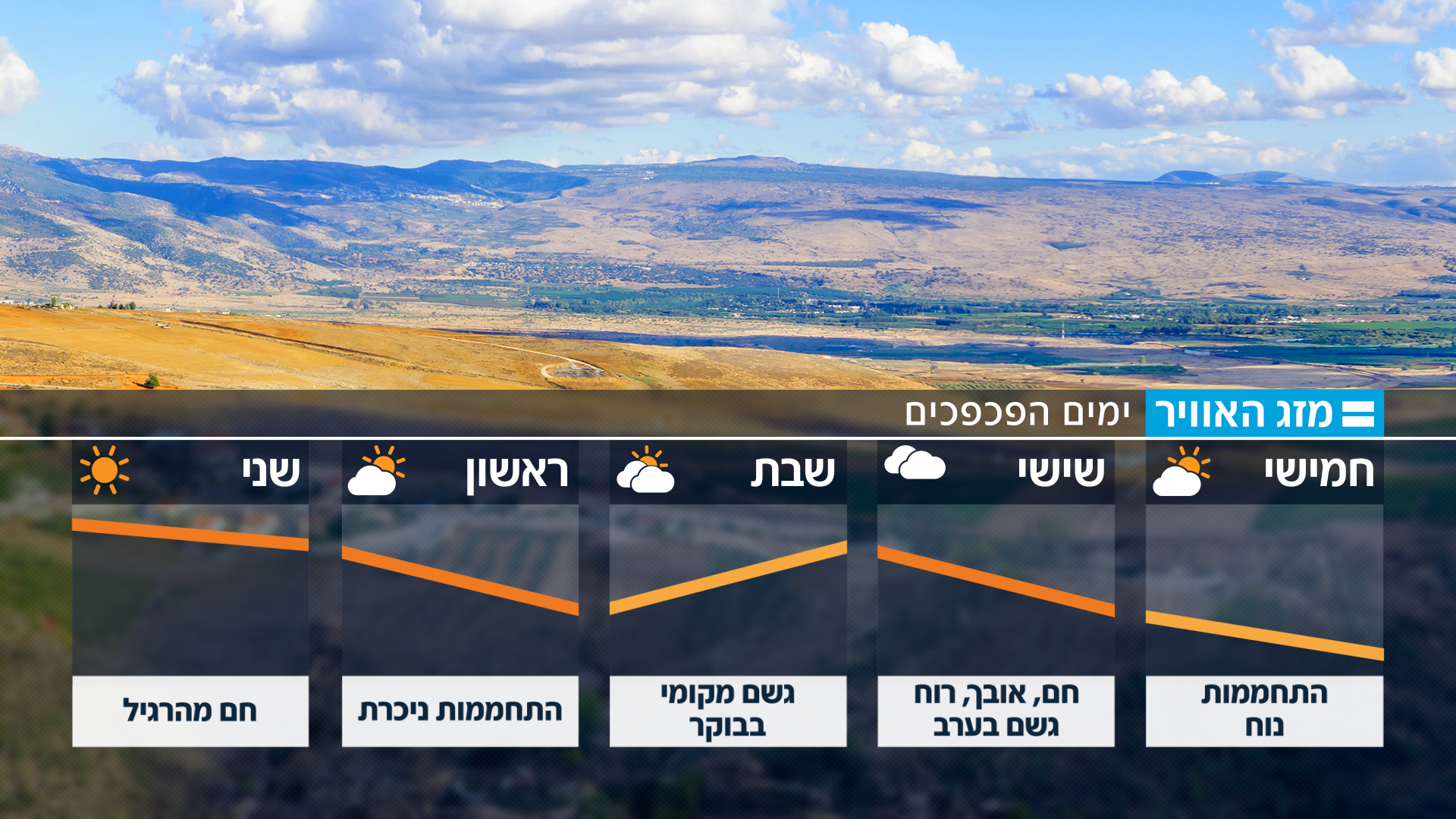 מזג האוויר צפוי להיות נוח עם עלייה קלה בטמפרטורות • ההתחממות תגיע לשיאה בבוקר יום שישי שיתאפיין בשרב ורוחות • המשך השבת יהיה נוח עם גשמים מקומיים - ובתחילת השבוע נחוש במגמת התבהרות