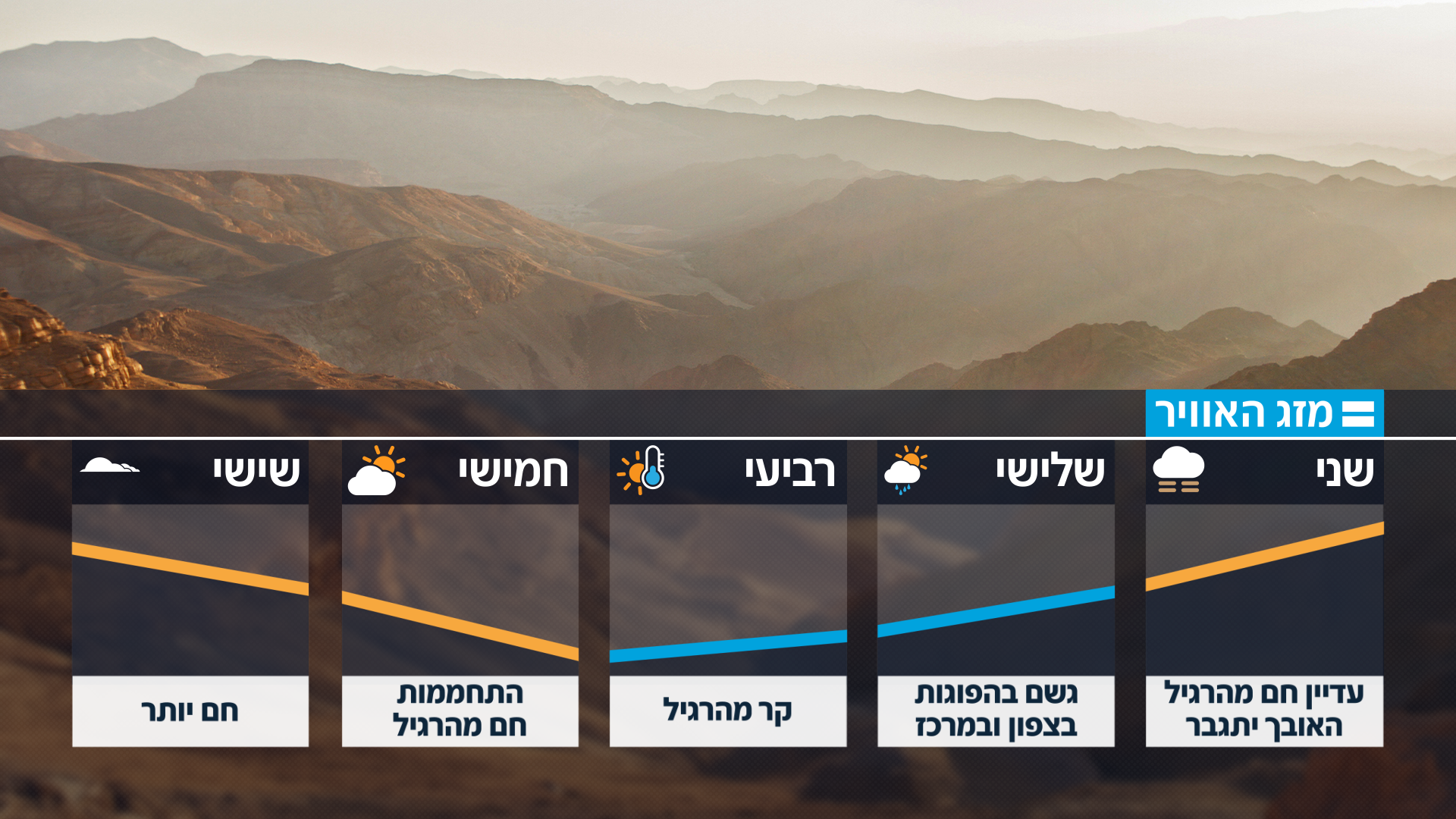 הטמפרטורות החזויות להיום: קצרין 13-21, חיפה 16-23, טבריה 14-22, כפר סבא 12-24, תל אביב 16-23, רחובות 15-24, ירושלים 15-20, שדרות 12-27, באר שבע 15-25 ובאילת 18-25 מעלות.