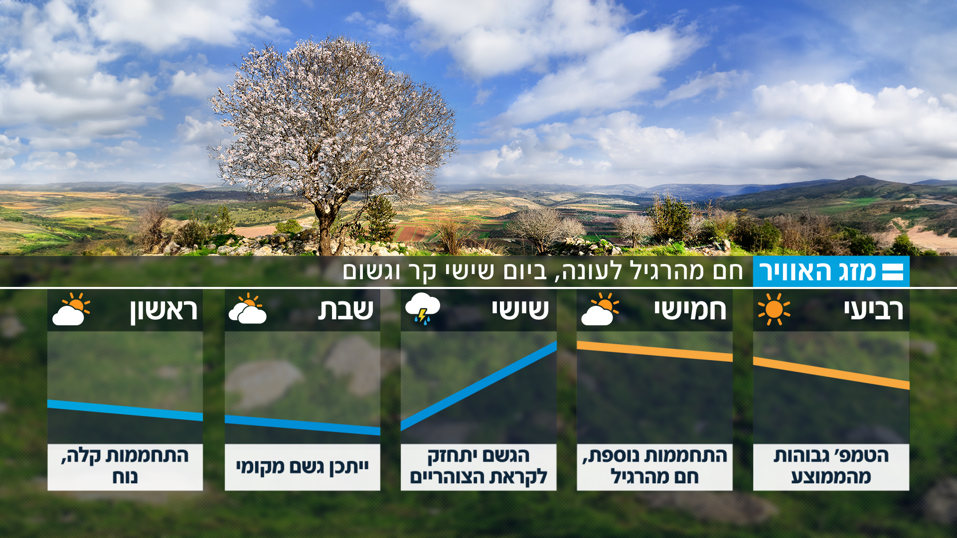 בירושלים צפויות 22 מעלות, ו-24 מעלות בבאר שבע • היום הכי חם של השבוע צפוי להיות יום חמישי • בסוף השבוע נרגיש מעבר חד וצניחה של הטמפרטורות, עם גשם, ברקים, רעמים, ברד, רוחות חזקות וגם אפשרות לשיטפונות