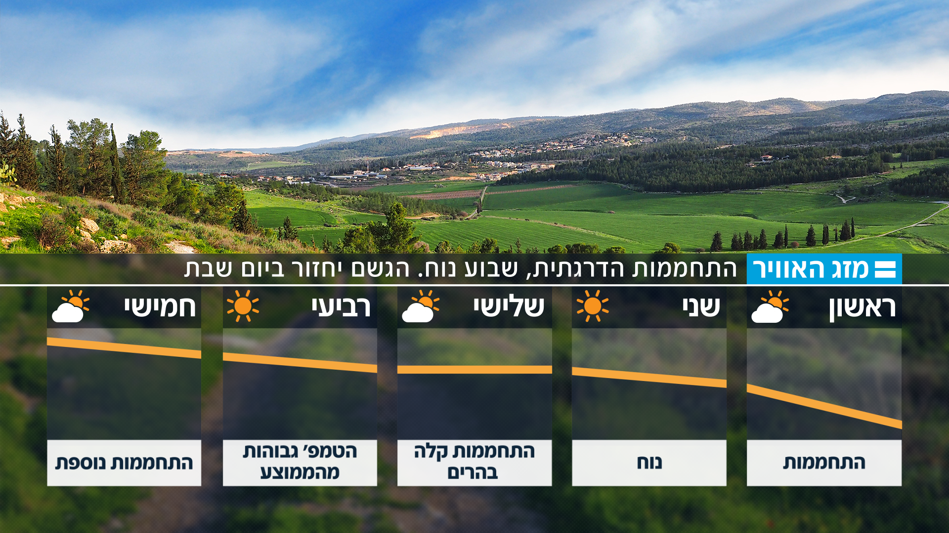 באמצע השבוע הטמפרטורות יהיו גבוהות מהממוצע • הימים החמים ביותר יהיו רביעי וחמישי • הגשם צפוי לחזור בסוף השבוע