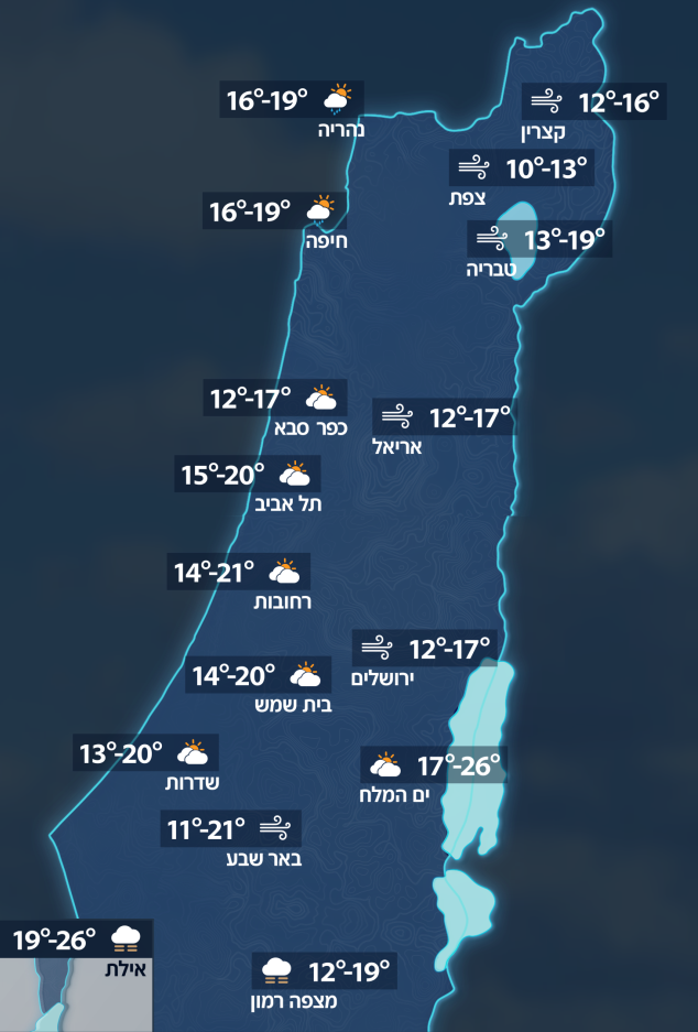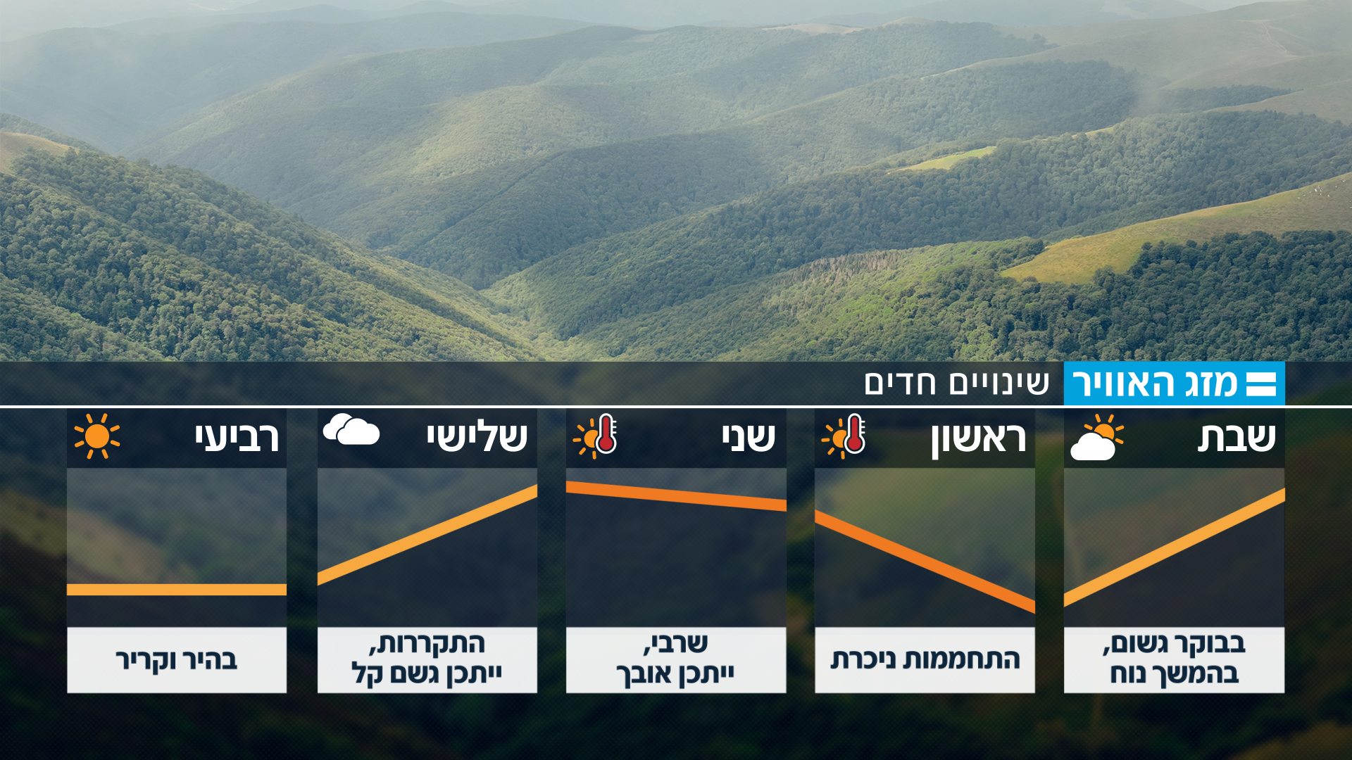 אחרי החום: ירידה בטמפרטורות • כבר במהלך הלילה התחילו הגשמים, שצפויים להתמקד במהלך היום באזור הצפון והמרכז • בשבוע הבא - מזג אוויר הפכפך