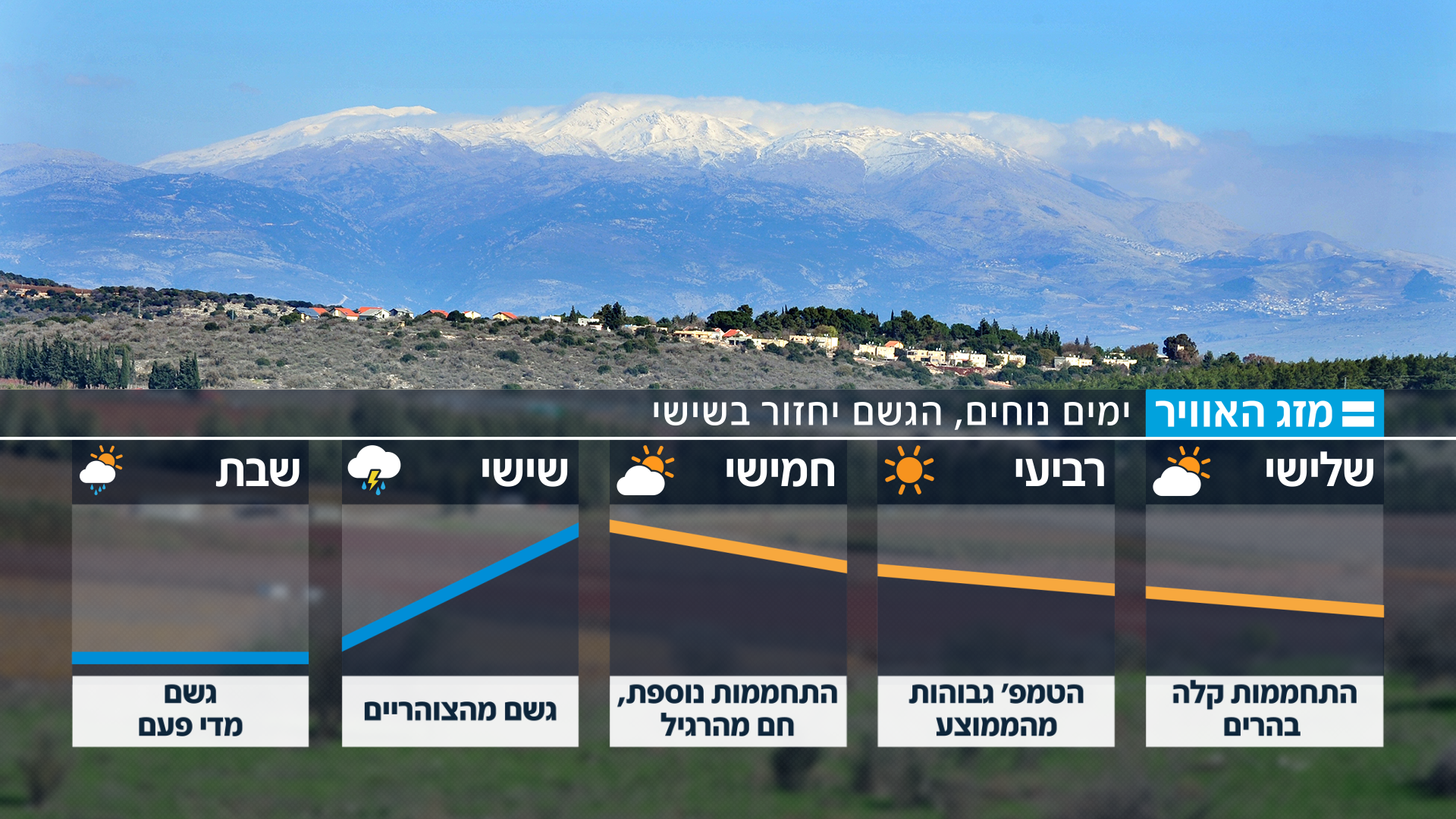 מגמת ההתחממות, לצד מזג האוויר הנוח, ילוו אותנו בימים הקרובים • צפי גם לענני צירוס גבוהים שיובילו לשקיעות יפהפיות • ביום שישי תחל מערכת גשם חדשה שתגיע לשיאה בשעות הערב • היא תיחלש בשבת - אך מזג האוויר יוסיף להיות סגרירי • התחזית