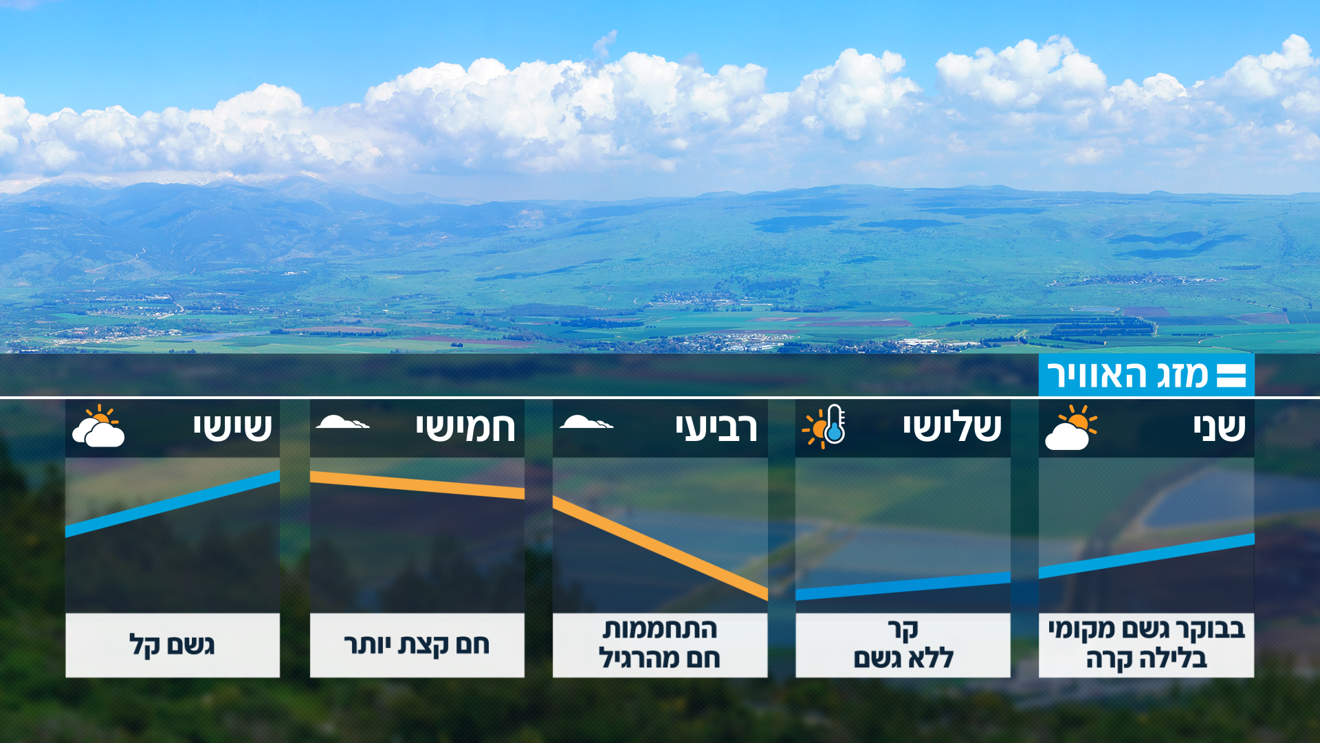 בשישי יחול מהפך נוסף; תורגש מגמת התקררות, ומשעות אחר הצוהריים צפוי גשם מקומי בצפון ובחוף.
