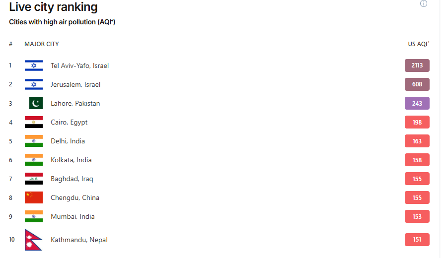 לפי המדד, שמתעדכן בזמן אמת, תל אביב וירושלים במקום הראשון בערים המזוהמות, כאשר תל אביב עם רמת AQI של יותר מ-2,000. לשם השוואה, במקום השלישי נמצאת לאהור בפקיסטן עם 243. לפי מדד איכות האוויר של המשרד להגנת הסביבה, באזורים רבים בארץ איכות האוויר היא בסביבות מינוס 400, רמה שנחשבת נמוכה מאוד.