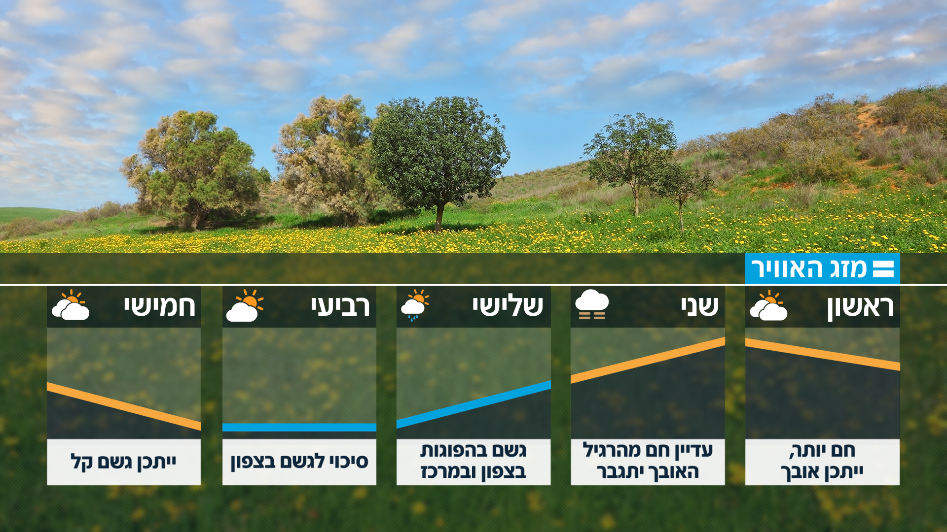 הטמפרטורות יהיו גבוהות מהממוצע לחודש פברואר בין 7 ל-10, מעלות וגם ביום שני צפוי להיות חם • ביום שלישי תורגש התקררות של ממש, גשם ירד מדי פעם בצפון ובמרכז • ברביעי עדיין יישאר קריר, אך ביום חמישי שוב מצפה יום חם יחסית