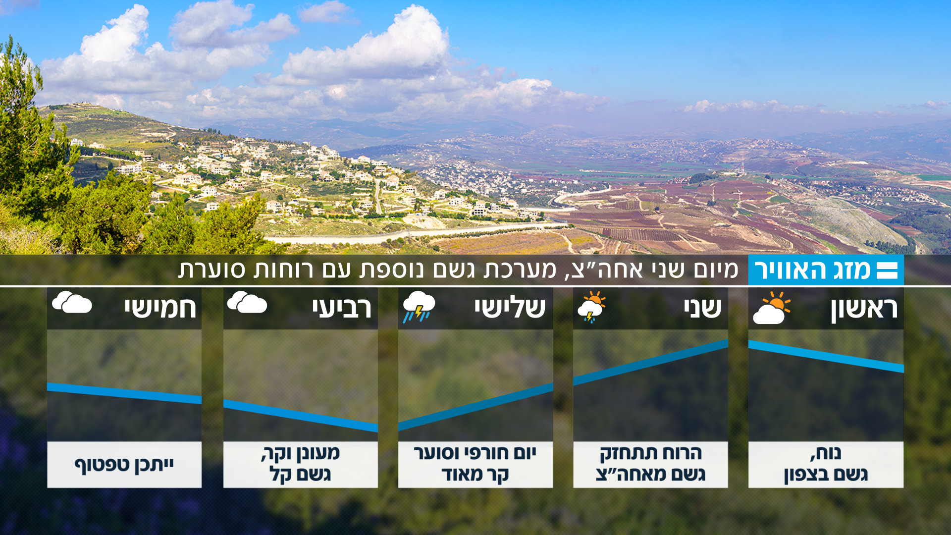 מיום שני יצנחו הטמפרטורות, וגשמים ירדו מהצפון ועד למרכז • שלג צפוי בחרמון ובפסגות הגבוהות של צפון רמת הגולן, רוחות עזות ינשבו • בדרום צפוי אובך, וישנו חשש משיטפונות בנחלי ים המלח ומדבר יהודה
