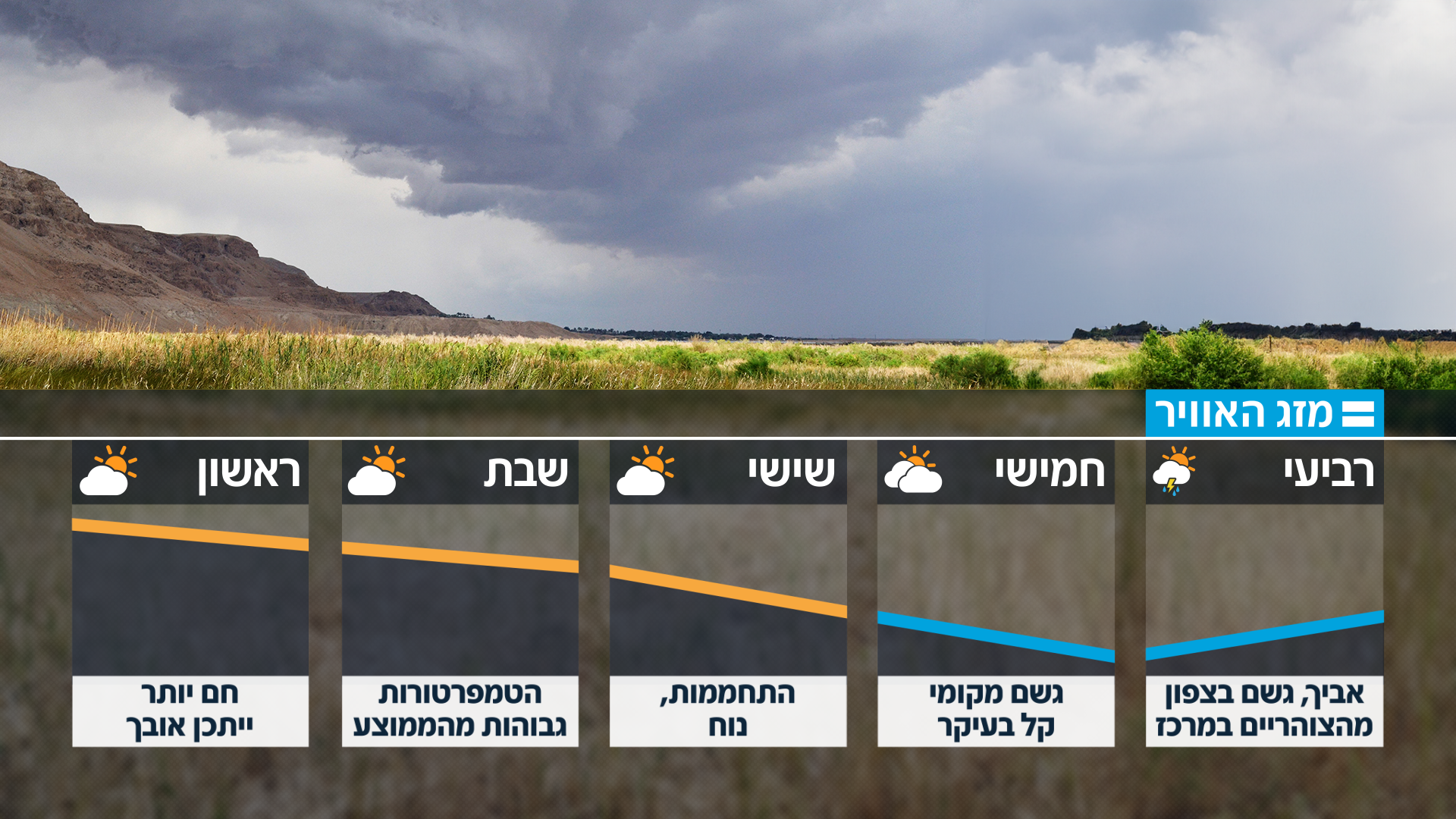 בשעות הערב הגשם ייחלש אך יוסיף לרדת לפרקים. מחר עדיין צפוי גשם מקומי קל, בעיקר במחצית הראשונה של היום. לקראת סוף השבוע תחול התחממות משמעותית, והטמפרטורות יעלו אל מעל לממוצע לעונה – מגמה שתימשך גם בתחילת השבוע הבא.