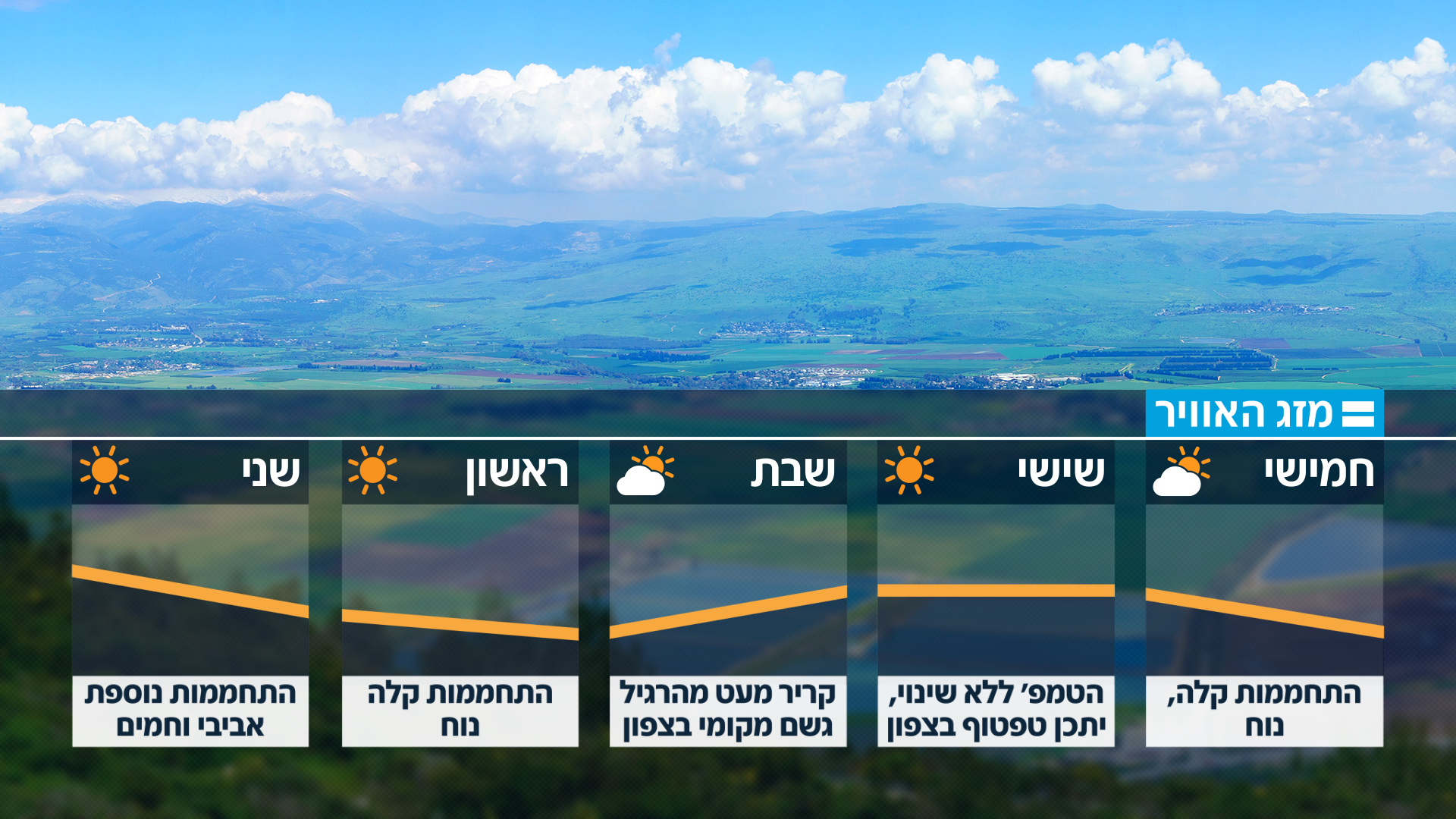 היום תורגש עלייה בטמפרטורות, ובמרבית אזורי הארץ יהיה נוח - אך הטמפרטורות עדיין יהיו נמוכות מהרגיל לעונה • מחר מזג האוויר ישאר ללא שינוי, ובשבת תורגש ירידה בטמפרטורות ויהיה קר מהרגיל לעונה - לצד גשמים שירדו בצפון ולאורך מישור החוף • מתחילת השבוע הבא תחל מגמת התחממות - לקראת מזג אוויר שרבי שיגיע לשיאו ברביעי ובחמישי