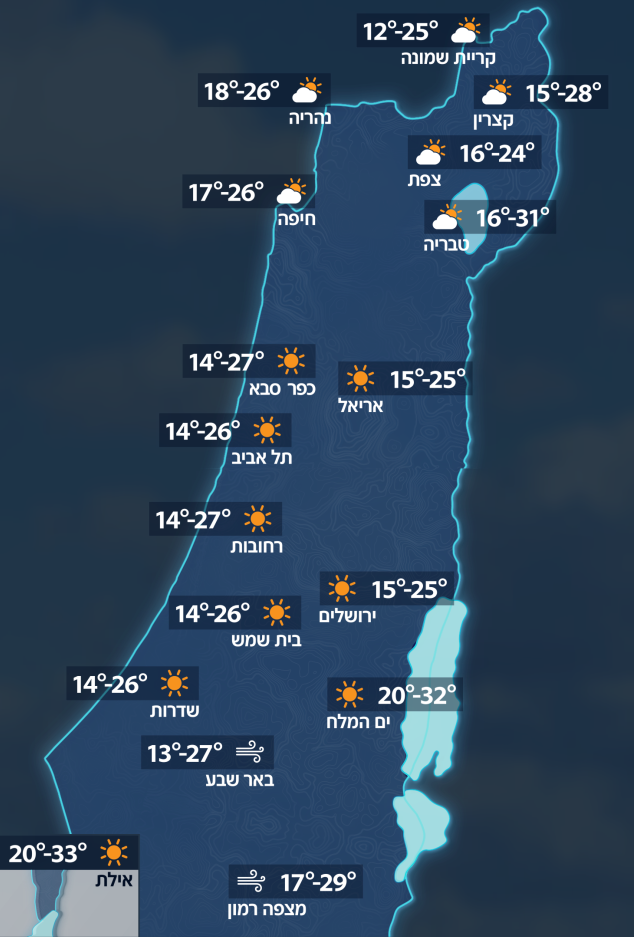 מפת הטמפרטורות מראה כי בטבריה ימדדו 31 מעלות, בקצרין 28 ובקריית שמונה 25 מעלות. באזור המרכז והדרום ימדדו בירושלים 25 מעלות, בים המלח 32 מעלות ובבאר שבע 27 מעלות, שם ינשבו גם רוחות חזקות.