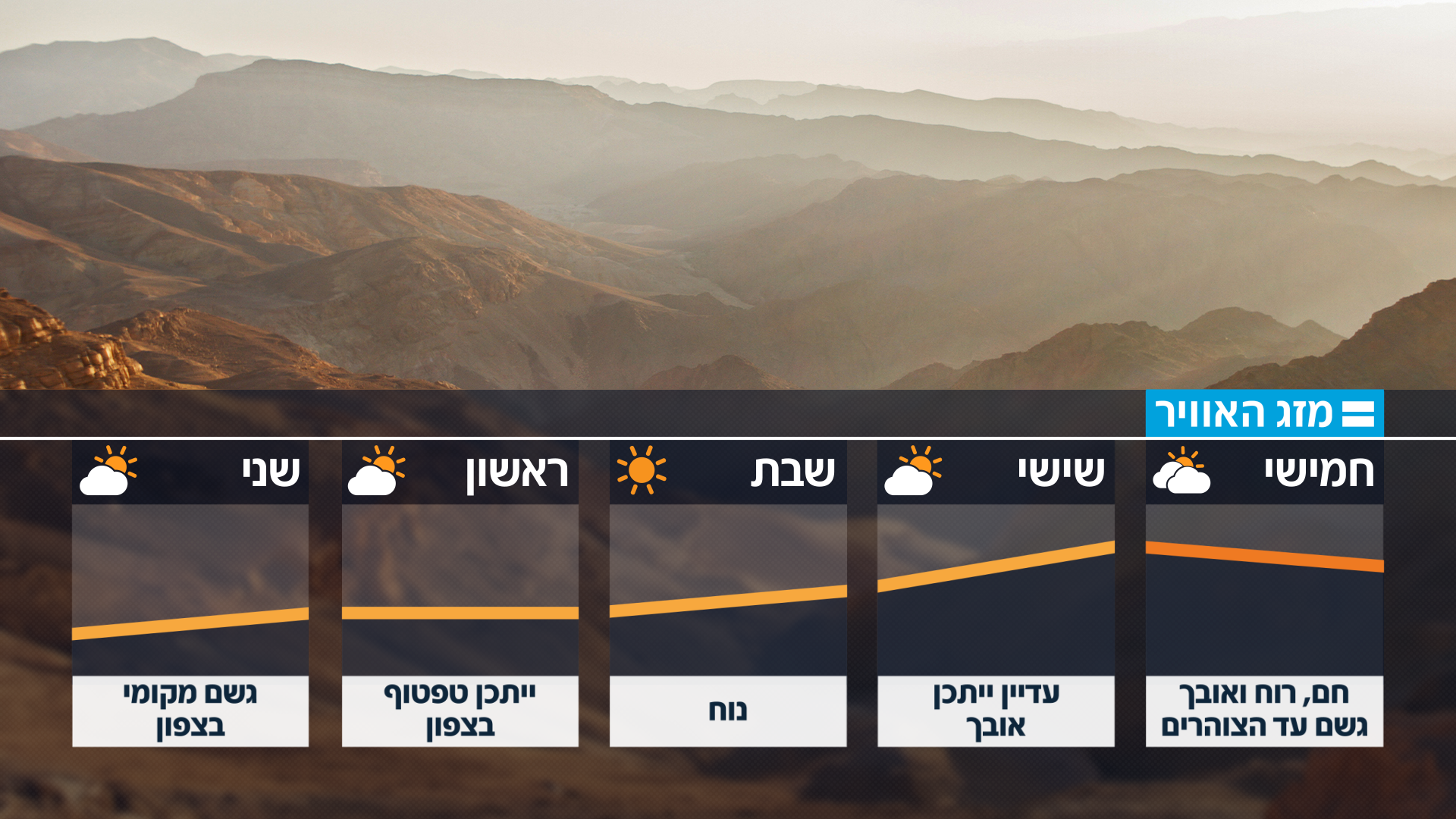 לאורך הלילה ירדו גשמים בכל רחבי הארץ, ורוחות חזקות נשבו • הבוקר תורגש התחממות קלה, לצד גשם קל בחלק מהארץ, רוחות חזקות ואובך • כביש 40 מצומת צחור למצפה רמון סגור משני הכיוונים • בסוף השבוע הטמפרטורות יעלו - ולאחר מכן שוב ירדו