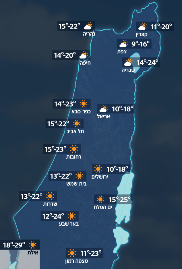 היום (שני) תורגש עלייה קלה בטמפרטורות ויהיה מעונן חלקית. בשעות הערב יוסיף להיות קריר מעט, בעיקר באזורי ההרים. מחר תחול התחממות נוספת שתורגש בעיקר בפנים הארץ ובהרים, ומזג האוויר ייעשה חם מהרגיל לעונה.