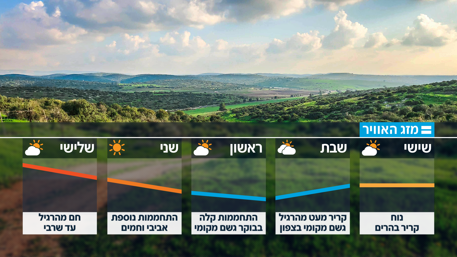 בנוסף לירידה שתורגש מחר, גשם מקומי צפוי לרדת בצפון עד לשעות הצהריים. בראשון עדיין קיים סיכוי לגשם מקומי בשעות הבוקר בעיקר בצפון. בשני הטמפרטורות יתחילו לעלות בעיקר בפנים הארץ ובהרים האוויר ומזג האוויר יהיה נוח.