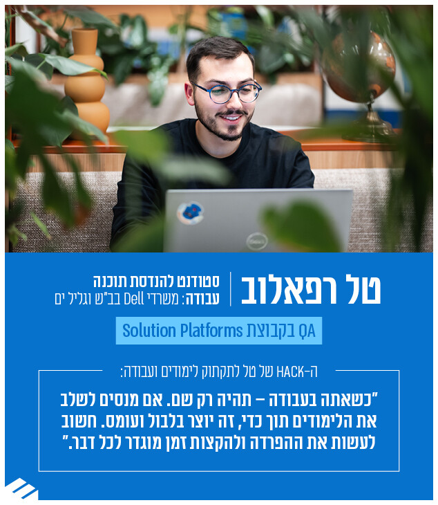 טל רפאלוב, סטודנט להנדסת תוכנה מהדרום, מפתח מוצרים גלובליים ב-Dell. "הקבוצה שלי מפתחת יכולות מתקדמות של אוטומציה מקצה לקצה. מה שמעניין אותי בעבודה הוא לראות את המוצר מבפנים ואיך הוא מגיב לעומסים שונים לפי כמות המשתמשים. כיף לעבוד על מוצר שיגיע בעתיד לאלפי משתמשים ולדעת שסטודנט כמוני נגע במוצר הסופי ושיש לי חלק בו.