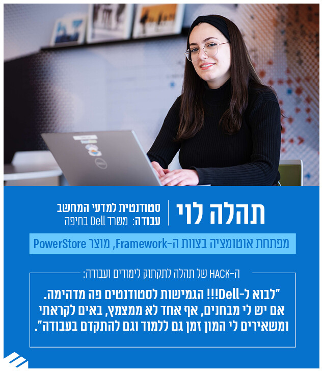 תהלה לוי, סטודנטית למדעי המחשב, מפתחת אוטומציה ב-Dell ותוך כדי כך מתחזקת נישואים טריים. "אני אוהבת את האתגר בתחום מדעי המחשב, החשיבה, הפוקוס על מתמטיקה. לכתוב קוד מאפס שעובד זה כיף. PowerStore, מוצר אחסון המידע המתקדם שהקבוצה שלי מפתחת, הוא מאד מעניין. אני עדיין לומדת אותו, ובהדרגה אני מבינה עוד ועוד חלקים".