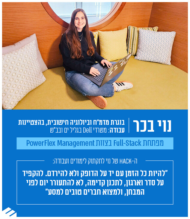נוי בכר סיימה את לימודיה לפני כשנה, וכבר מובילה פיצ'ר מורכב ב-Dell Technologies. "למדתי מדעי המחשב עם התמחות בביולוגיה חישובית, שעוסקת בפתרון בעיות ביולוגיות בעזרת כלים חישוביים - תחום מרתק שכולל, למשל, את פיתוח חיסוני הקורונה מבוססי mRNA. בתחום מדעי המחשב יש המון מקום ליצירתיות ולמעוף וזה קסם לי. במהלך הלימודים באוניברסיטת בן-גוריון היה לי שותף לדרך. בסמסטר א' אמרתי לו: 'אני ואתה הולכים לעשות את כל העבודות והמשימות ביחד', וכך היה".
