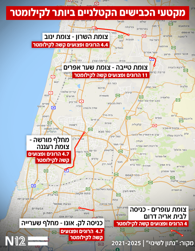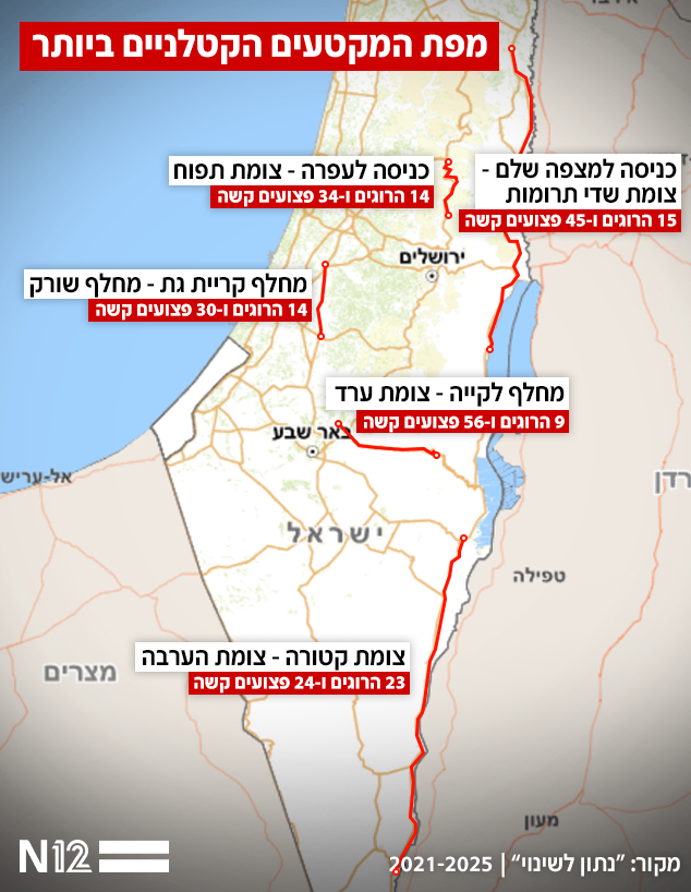 מאז תחילת השנה נהרגו 400 ישראלים בכבישים, יותר מכל שנה אחרת בעשור האחרון • ניתוח "נתון לשינוי" שמפורסם ב-N12 חושף את המקטעים הכי מסוכנים בכבישי ישראל • דוח המבקר הצביע על כשלים חמורים בטיפול בדרכים בין-עירוניות