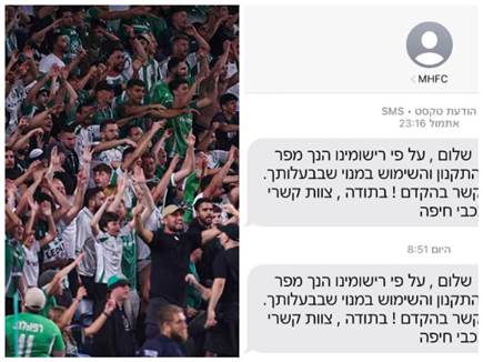 בהודעה נכתב: "על פי רישומינו הנך מפר את כללי התקנון והשימוש במנוי שבבעלותך. נא ליצור קשר בהקדם! בתודה, צוות קשרי לקוחות מכבי חיפה".