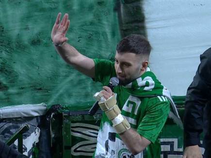 "עברתי הרבה מנהרות עזה, אבל המנהרה שבה עברתי בדרך לדשא היתה הכי יפה. עכשיו שאני פה, אני גאה להגיד שסוף סוף חזרתי הביתה", אמר מתן אנגרסט לקהל הירוק. לאחר מכן, הפעיל את עשרות האלפים ביציעים בשירת "יאללה מכבי שלי".