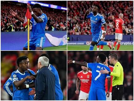 - התלונה של ויניסיוס המשיכה למהומה גדולה, הברזילאי שזעם ירד לספסל ותחילה סירב לשוב לדשא. השופט עצר את המשחק למספר דקות כחלק מפרוטוקו האנטי גזענות, וגם שלף כרטיס אדום לשלושה אנשי צוות מבנפיקה, ולאחר הפסקה לא קצרה הורה להמשיך את המשחק, כשמאז ויני סופג שריקות בוז צורמות במיוחד בכל נגיעה.