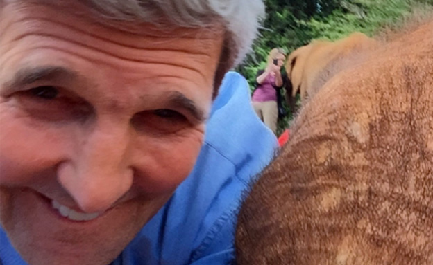 צפו: כשקרי פגש את הפיל הקנייתי מזכיר המדינה לא נותר אדיש - ודרש סלפי למזכרת 04.05.15