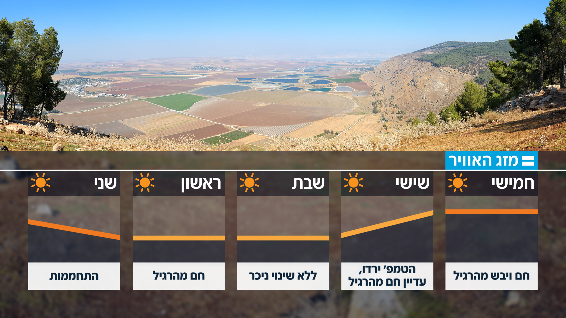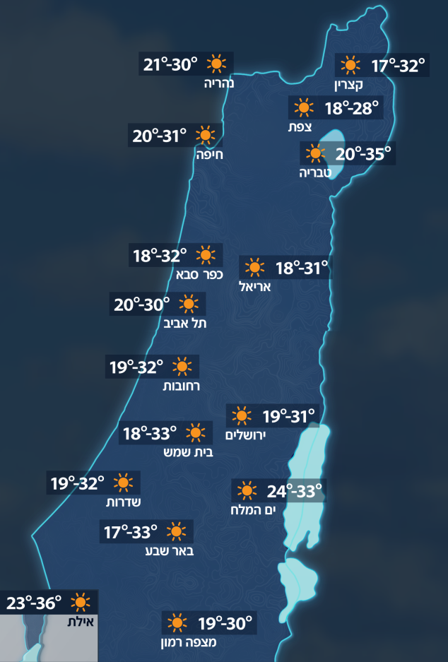 היום נרגיש שוב עלייה בטמפרטורות, בעיקר באזורים הפנימיים של הארץ. בימים הקרובים מזג האוויר יהיה חם באופן יחסי. ברביעי הטמפרטורות ירדו, אבל יישאר חם מהרגיל לעונה בעיקר באזורי ההרים. החל מחמישי ובסוף השבוע מזג האוויר יהיה חם ויבש. מזג אוויר זה ככל הנראה ימשיך עד תחילת שבוע הבא.