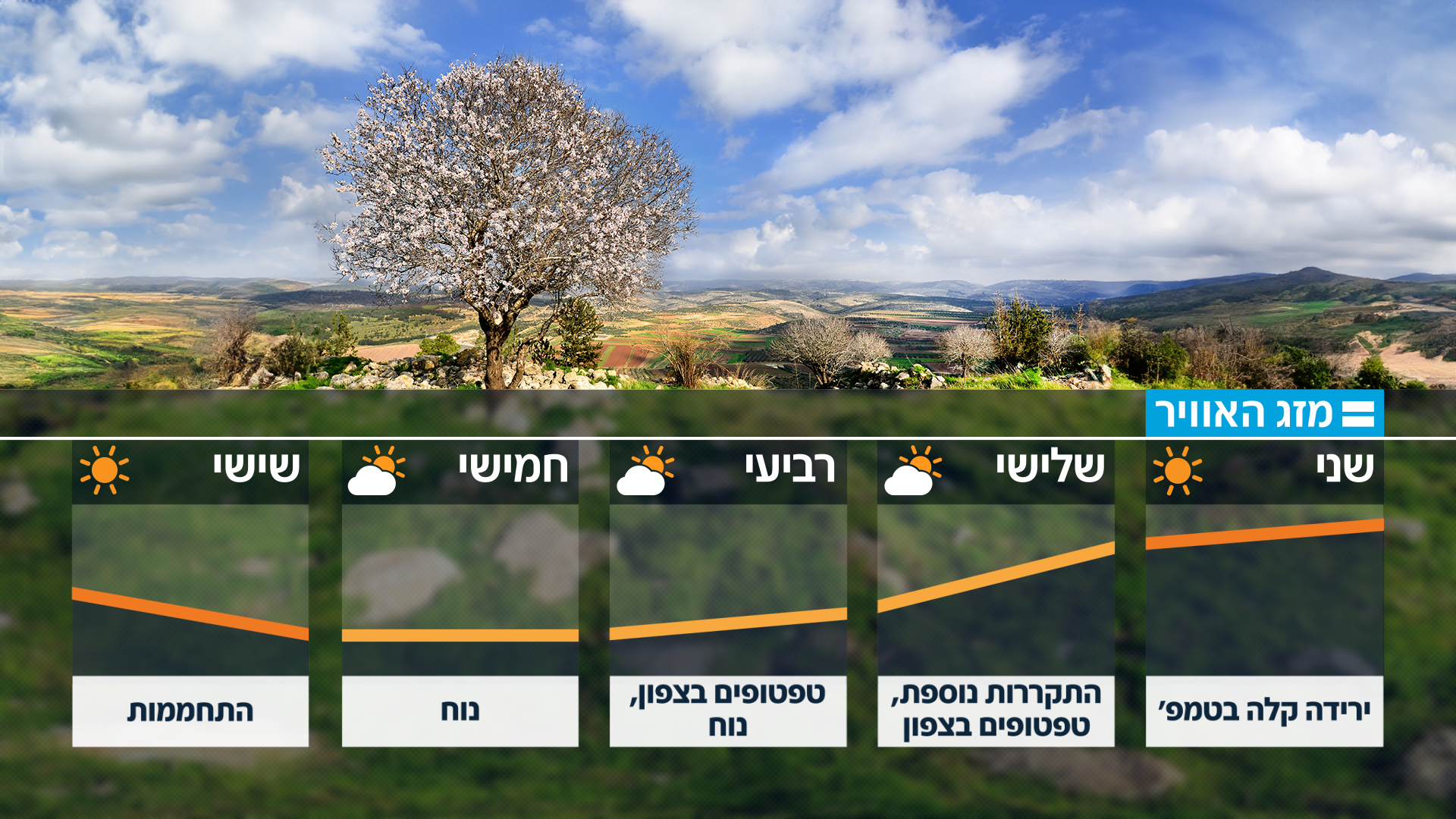 היום (שני) תחול ירידה בטמפרטורות ומזג האוויר יהיה נוח. מחר תחול ירידה נוספת במעלות וייתכנו טפטופים בצפון.