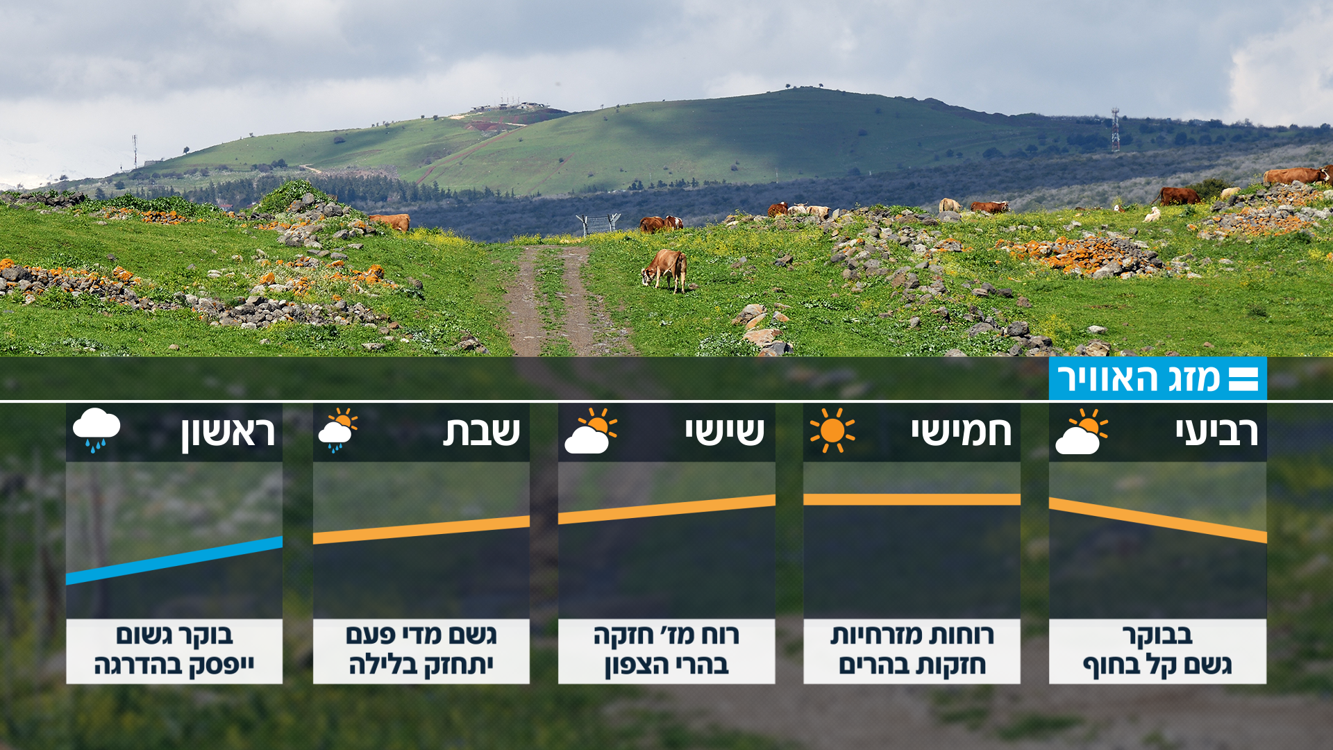 בימים הקרובים לא צפוי שינוי חד. מזג האוויר יישאר יציב, ואף תחול התחממות הדרגתית. ביום חמישי השמיים יהיו בהירים ברובם, אך ינשבו רוחות מזרחיות חזקות, בעיקר באזורי ההרים. ביום שישי כבר ייתכן טפטוף מקומי, בעיקר בצפון הארץ ולאורך מישור החוף, אך עדיין לא מדובר במערכת גשם משמעותית.
