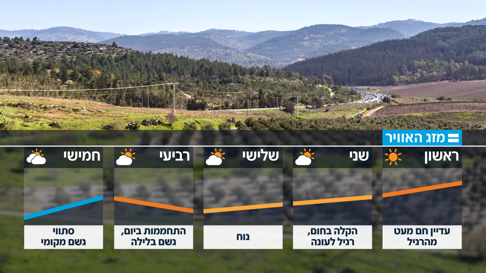 מזג האוויר הסתווי יחליף השבוע את ימי השרב החמים • בימים הקרובים תורגש מגמת התקררות ובמהלך החג יישאר מזג האוויר נוח ביום וקריר בלילה • מיום רביעי אחר הצוהריים יתחיל אירוע גשם קצר בעיקר בצפון הארץ ובמרכזה • התחזית המלאה לערב החג ולשבוע הקרוב