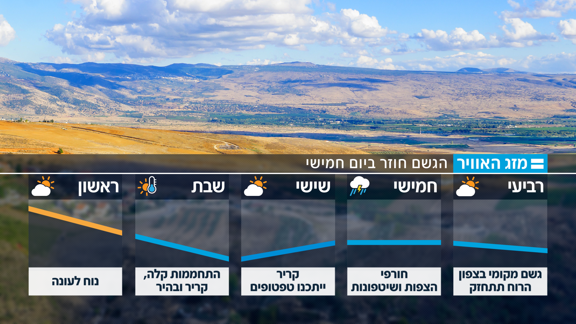 היום צפוי יום נוח עם הרבה שמש ומעט עננים, והטמפרטורות יהיו ממוצעות לעונה • משעות הלילה הגשם יחזור – ומחר יהיה גשום, עם כמויות גשם גדולות במיוחד בצפון ובשרון • בהמשך הוא ייפסק, כשהגשם הבא צפוי ככל הנראה רק באמצע החודש • התחזית המלאה