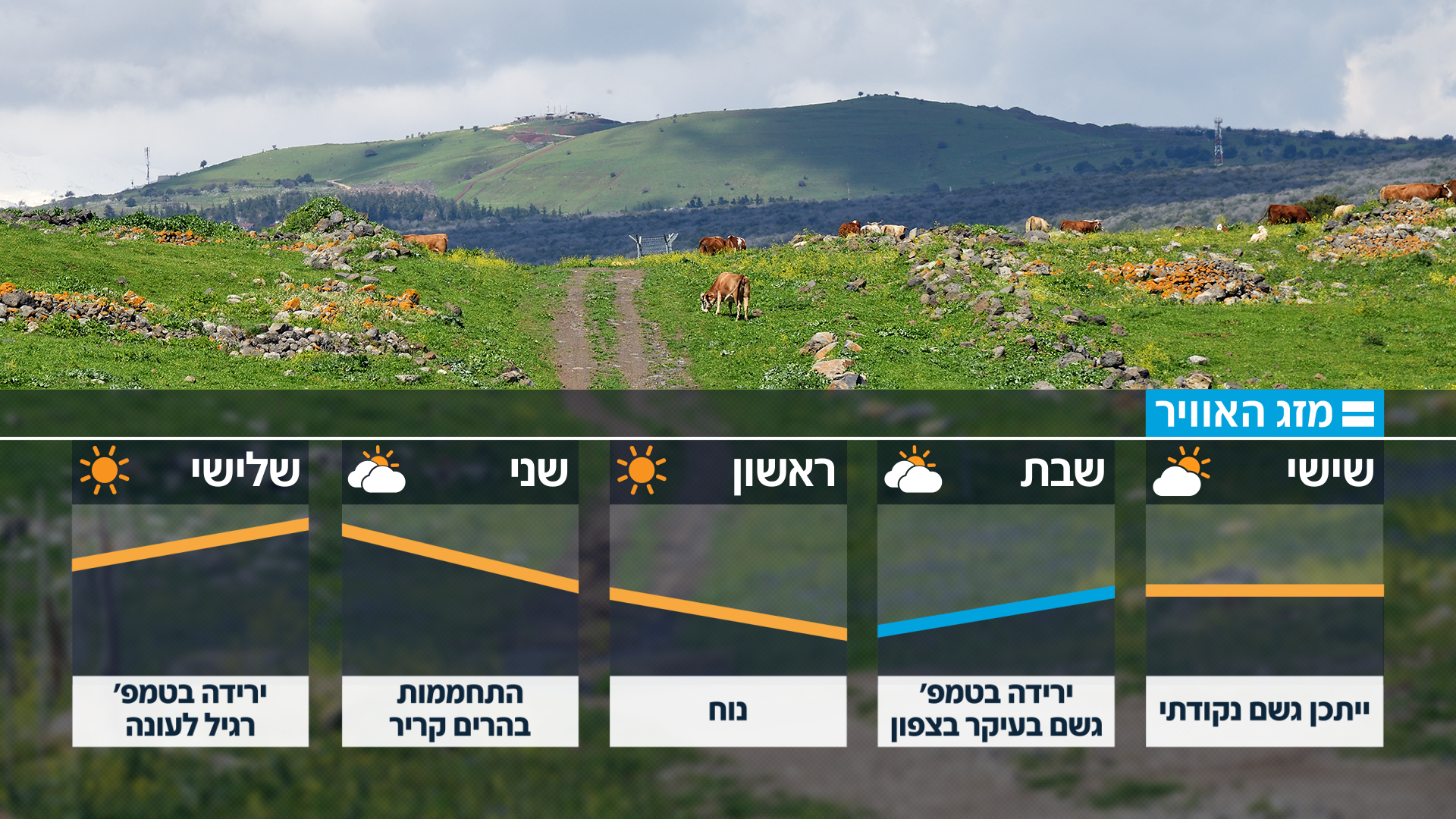 הטמפרטורות צפויות לעלות היום בהדרגה ברחבי הארץ, העננות תתפזר ונזכה ליותר שעות של שמש • בשבת תחול ירידה קלה בטמפרטורות וגשם מקומי ירד בעיקר בצפון משעות הצוהריים, ייתכנו גם רעמים וברקים • בתחילת השבוע מזג האוויר יוסיף להיות נעים, ובהמשך תורגש התחממות קלה