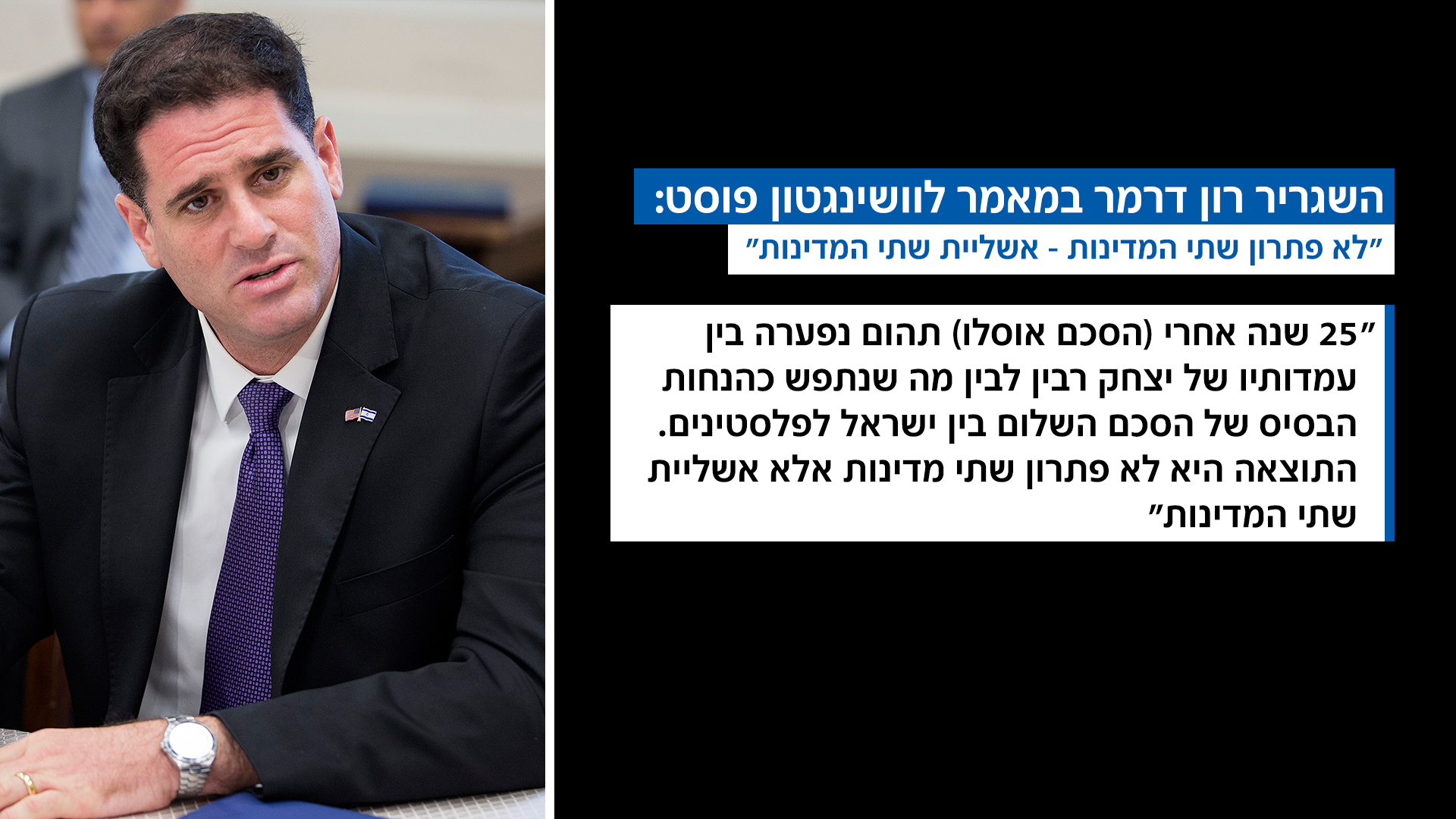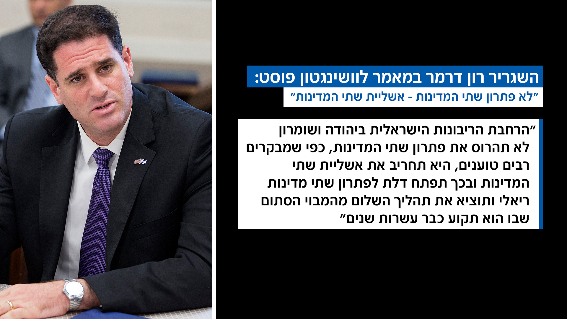 בטור דעה שפורסם בעיתון הוושינגטון פוסט הגיב השגריר הישראלי לנושא הסיפוח והריבונות • השגריר רון דרמר הסביר באריכות מדוע הצעד החד צדדי כביכול שבו נוקטת ישראל הוא הכרחי, ומציג מפרטי התוכנית • "ישראל מקווה שהסיפוח יגרום לפלסטינים להבין אחת ולתמיד - אנחנו כאן כדי להשאר"