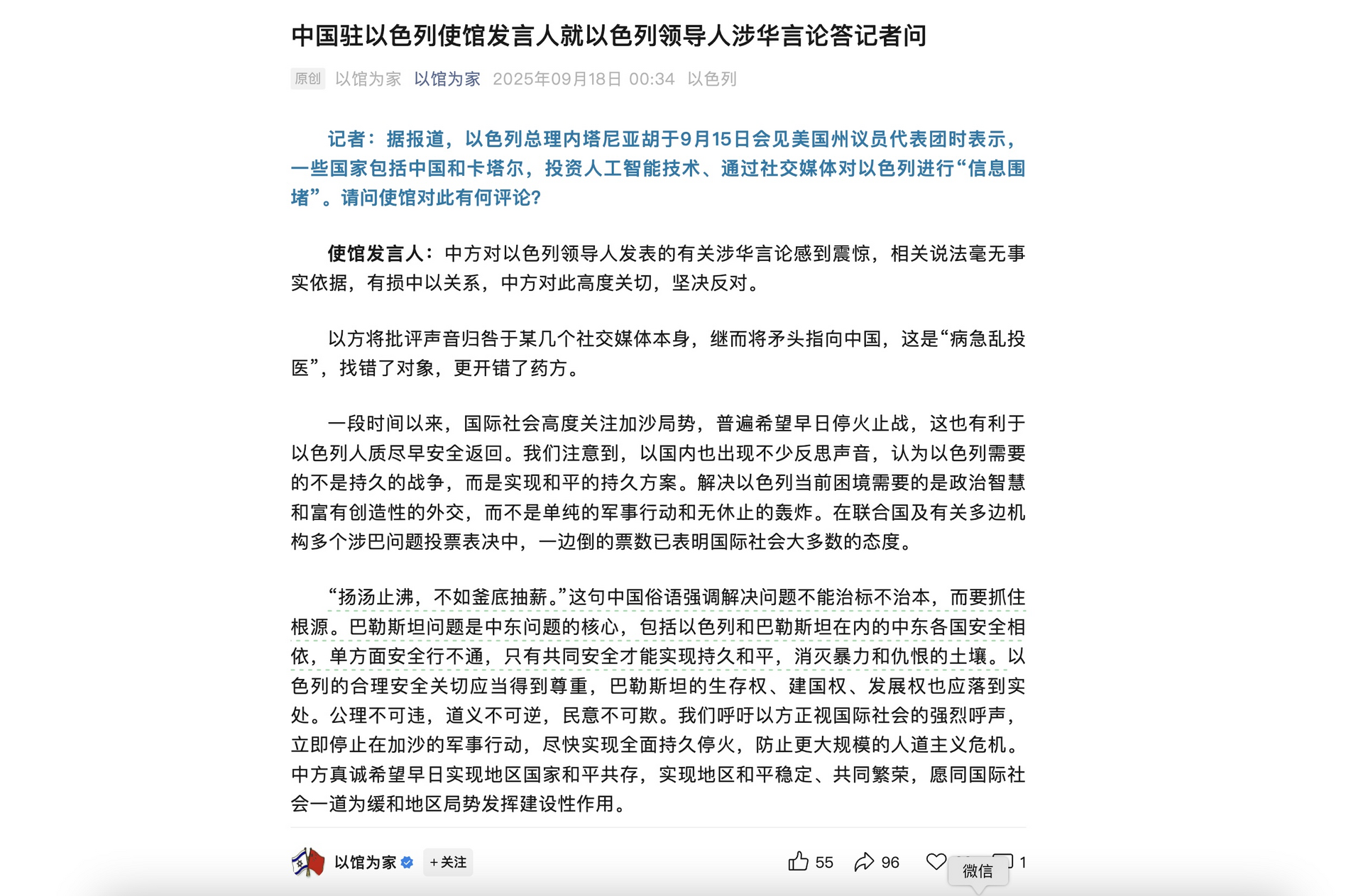 דובר שגרירות סין בישראל אמר הלילה: "סין הופתעה עמוקות מהצהרות מנהיג ישראל בנוגע לסין. הדברים חסרי כל בסיס עובדתי, פוגעים ביחסי סין-ישראל וסין מתנגדת להם בתוקף. ההאשמות מצד ישראל, שממקדות את הביקורת בכמה פלטפורמות מדי חברתית ואז מפנות את האצבע המאשימה לסין, הן דוגמה למצב שבו 'מרוב ייאוש מטפלים בסימפטומים במקום בבעיה האמיתית" - בוחרים יעד שגוי ואז נותנים תרופה שגויה".