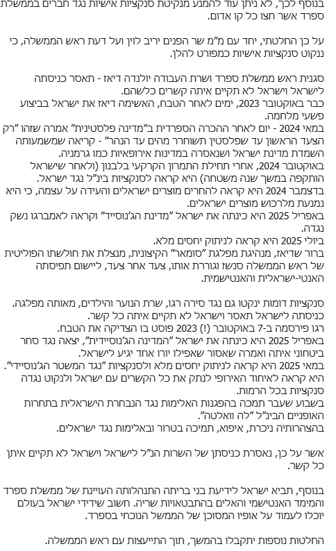 בנוסף לביקורת החריפה, סער הודיע כי ישראל תטיל סנקציות אישיות נגד סגנית ראש ממשלת ספרד ושרת העבודה יולנדה דיאז ושרת הנוער והילדים סירה רגו.