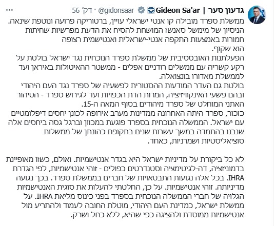 "ממשלת ספרד מובילה קו אנטי ישראלי עוין, ברטוריקה פרועה ונוטפת שנאה", כתב סער. "הניסיון של ממשל סנצ'ס המושחת להסיח את הדעת מפרשיות שחיתות חמורות באמצעות התקפה אנטי-ישראלית ואנטישמית רצופה הוא שקוף".