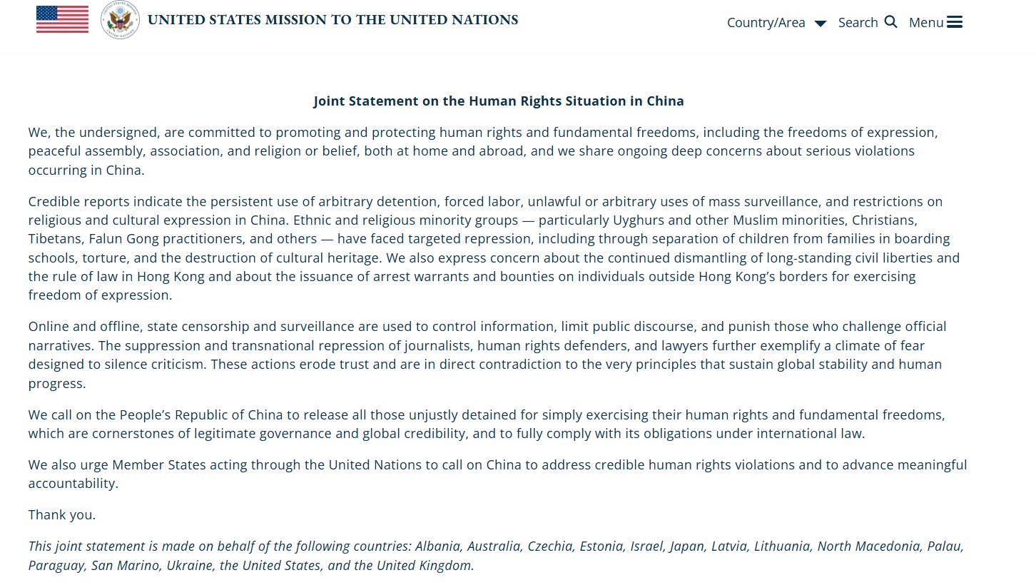 "אנו קוראים לרפובליקה העממית של סין לשחרר את כל אלה שנעצרו שלא בצדק רק משום שמימשו את זכויותיהם וחירויותיהם הבסיסיות - אבני יסוד של ממשל לגיטימי ושל אמינות בין-לאומית - ולעמוד באופן מלא בחובותיה על פי המשפט הבין-לאומי. אנו גם קוראים למדינות החברות הפועלות במסגרת האו"ם לדרוש מסין להתמודד עם הפרות זכויות האדם המיוחסות לה ולקדם מנגנוני אחריות אמיתיים".