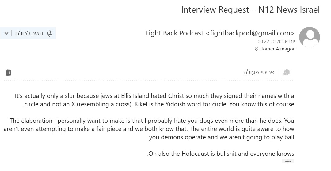 "תגיד ליהודון הזה ללכת להזדיין", כתב המשפיען האמריקני ג'ייק שילדס לדוברו במענה לפניית מגזין N12 לשיחה איתו. דוברו הוסיף במייל: "אני שונא אתכם, הכלבים, אפילו יותר מג'ייק. כל העולם יודע איך אתם השטנים מתנהלים. אה, והשואה היא חארטה וכולם יודעים את זה". השניים פרסמו את ההתכתבות בגאווה בעמוד של הפודקאסט של ג'ייק שילדס, שלו יותר מ-70 אלף עוקבים ברשת X ומאות אלפי מאזינים בפלטפורמות השונות.