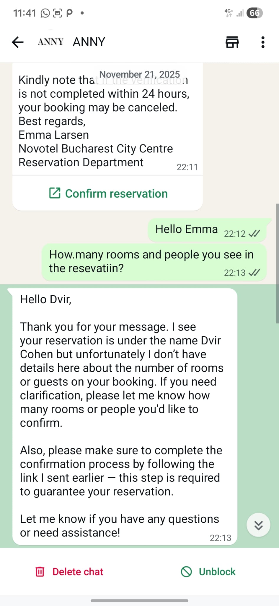 במקביל, כאשר כהן ניסה לאתגר את "אמה" שכתבה לו כביכול מהמלון ושאל מה מספר החדרים בהזמנה שלו, היא השיבה שהיא רואה את ההזמנה, אך לצערה אין לה פרטים לגבי מספר החדרים או האורחים, וביקשה ממנו שוב להשלים את תהליך האישור דרך הקישור.