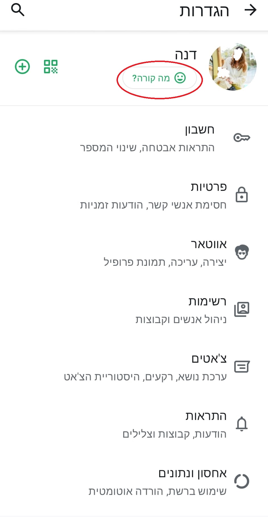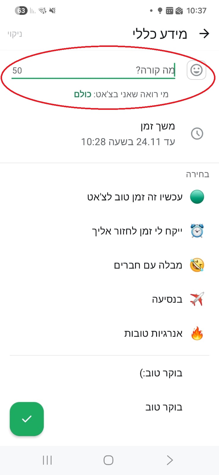 תוכלו גם לבחור את הסטטוס מתוך האפשרויות המובנות - "עכשיו זה זמן טוב לצ'אט" (שמסומן בעיגול ירוק, מה שהיה אונליין), "ייקח לי זמן לחזור אליך", "מבלה זמן עם חברים", "בנסיעה" (עם ציור של מטוס), ו"אנרגיות טובות".