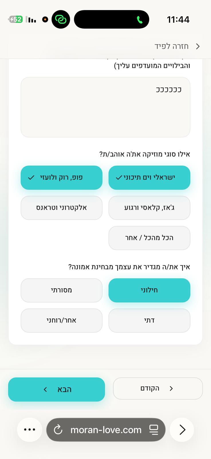 השאלון המוצג למשתמשים כולל פרטים בסיסיים (עיר מגורים, גובה, מספר ילדים), רקע והרגלים (השכלה, עישון, מצב בריאותי), וכן העדפות זוגיות כמו טווח הגילים והסטטוס של בן/בת הזוג הרצויים. בנוסף, מופיעות שאלות פתוחות המנסות לרדת לעומק האופי וסגנון החיים: איך אחרים מתארים אתכם? במה אתם גאים? מהם התחביבים שלכם? כיצד נראה דייט ראשון אידיאלי? ומהם ערכי הזוגיות שחשוב לכם לחלוק.
