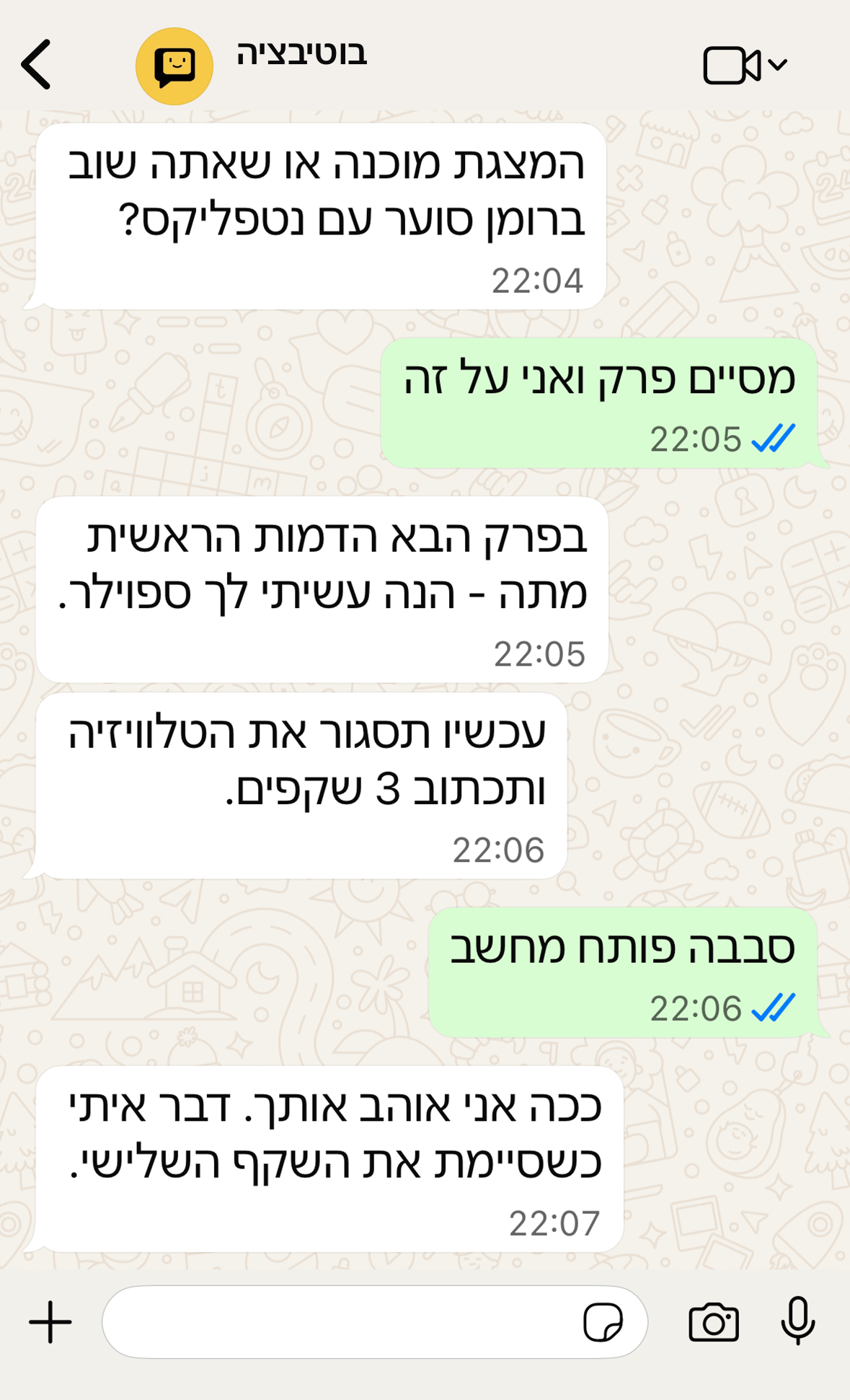 "למשל, אפקט הרנדומליות", הוא מדגים, "כשאנחנו גוללים בפיד, אנחנו אף פעם לא יודעים מה יהיה הפוסט או הסרטון הבא שיגיע. זה אחד הדברים שגורמים לנו להמשיך לגלול בלי סוף. הבנו שהבוט שלנו צריך לא סתם להזכיר למשתמש מה המשימה שלו, אלא כל פעם לפנות אליו ולתת לו פידבק בצורה שונה".
