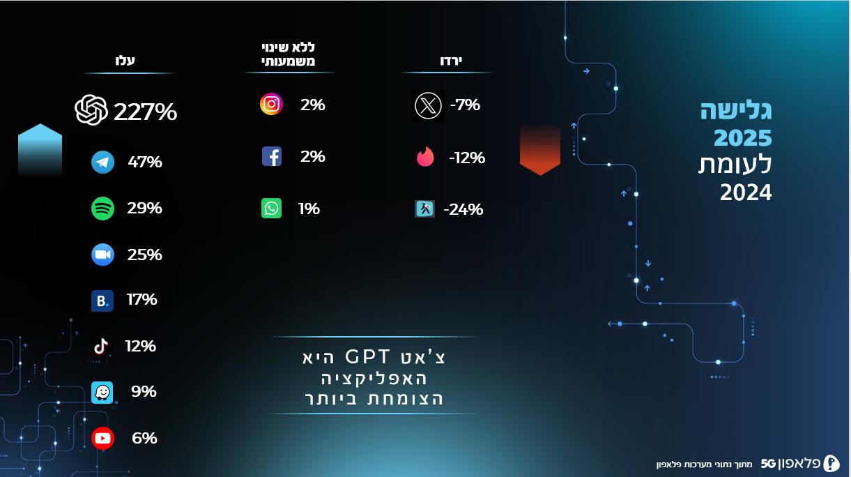 הנתון המטלטל ביותר בדוח נוגע למערכת היחסים של הישראלים עם מנועי החיפוש. על פי הנתונים, מחצית מהישראלים (50%) כבר נעזרים בכלי בינה מלאכותית כתחליף לחיפוש בגוגל. נתון זה מקבל חיזוק ממעמדה של אפליקציית ChatGPT, שהוכתרה כאפליקציה הצומחת של השנה, עם זינוק מטאורי של 227% בשימוש לעומת השנה הקודמת. יש לציין שבסקר דומה של חברת בזק מתחילת החודש, גוגל יכולה לזקוף לזכותה את הקפיצה הגדולה עם כמעט פי 2 ממה עשתה בשנה – משימוש של 22% בג'מיני בשנת 2024 לשימוש של 42% בשנת 2025.