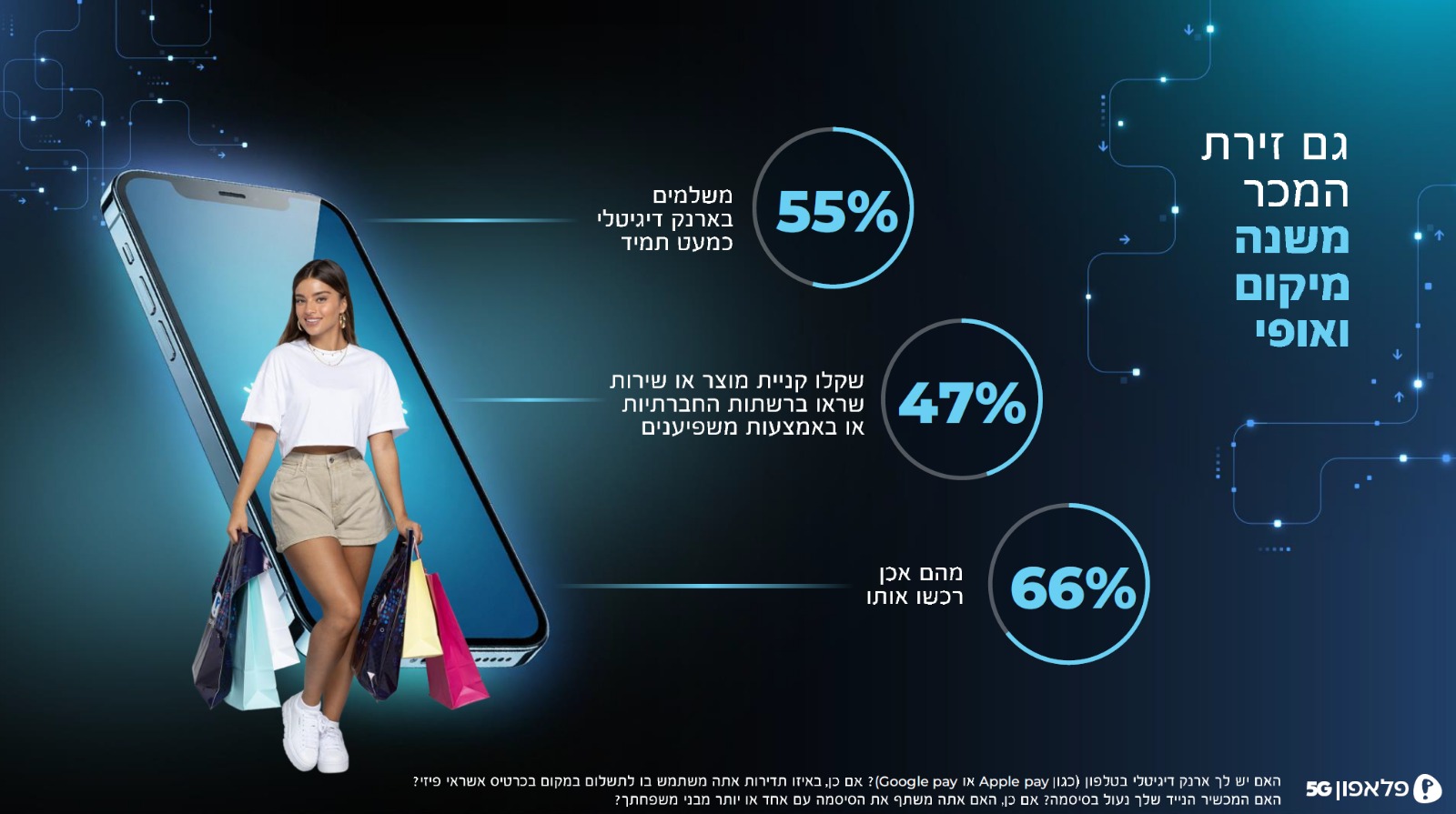 בכל הנוגע לארנק שלנו, הוא הופך לדיגיטלי לחלוטין: 55% מהישראלים משלמים כמעט תמיד באמצעות הטלפון הנייד, מה שמראה את האימוץ המהיר של הישראלים לגוגל וולט ואפל פיי. השפעת הרשתות החברתיות על הכיס שלנו דרמטית: 66% מהישראלים ששקלו לרכוש מוצר שראו אצל משפיענים או בפיד ביצעו את הרכישה בפועל.