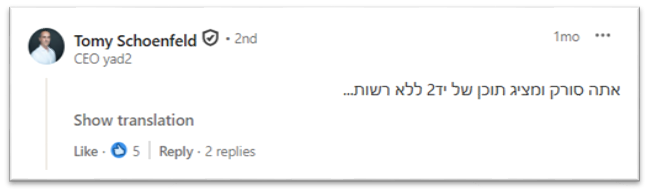 "מתוך מחויבות זו למידע העולה לפלטפורמה, יד2 רואה בחומרה כל ניסיון להעתיק, לסרוק או לשאוב מידע מהאתר ללא הרשאה ובניגוד לדין, ולא תשלים עם פעילות מסוג זה".