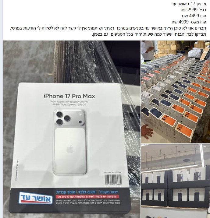 בקבוצת הפייסבוק "מכורי אושר עד" פרסמו היום תמונות של מכשירי מסדרת אייפון 17 במרכז הסופר, וכן בקבוצות של אוהדי אפל, כמו האפליסטים.
